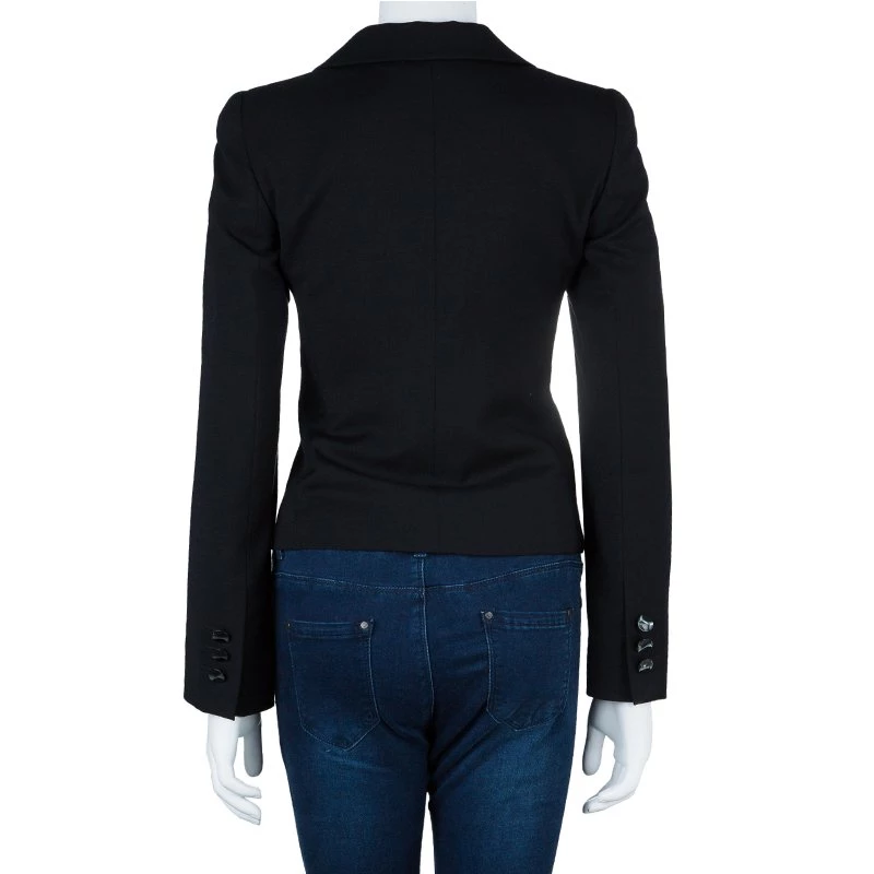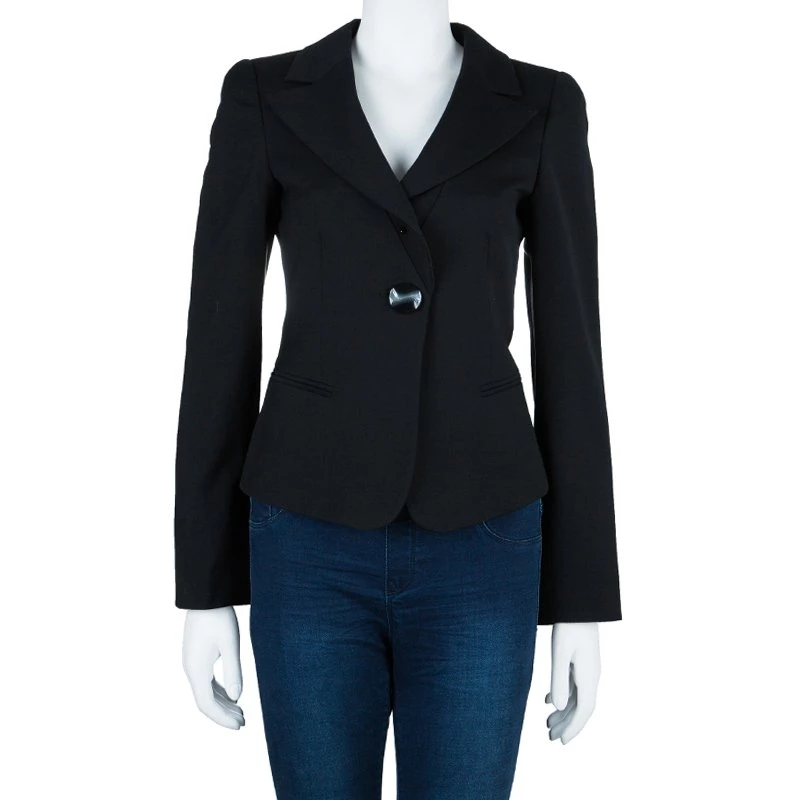This Emporio Armani blazer will have you look smart and chic at the same time. Made from pure wool, its single breasted design features a figure-hugging cut, long sleeves, pockets and lapel collars. It comes accented with a big black button at the front.