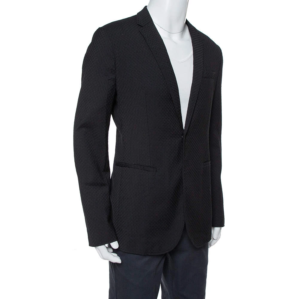 This black blazer from Emporio Armani is made of textured wool and features a modern silhouette. It flaunts notched lapels, front button fastening, and two pockets. You’ll look stylish when you’ll wear this creation with your formal ensemble
