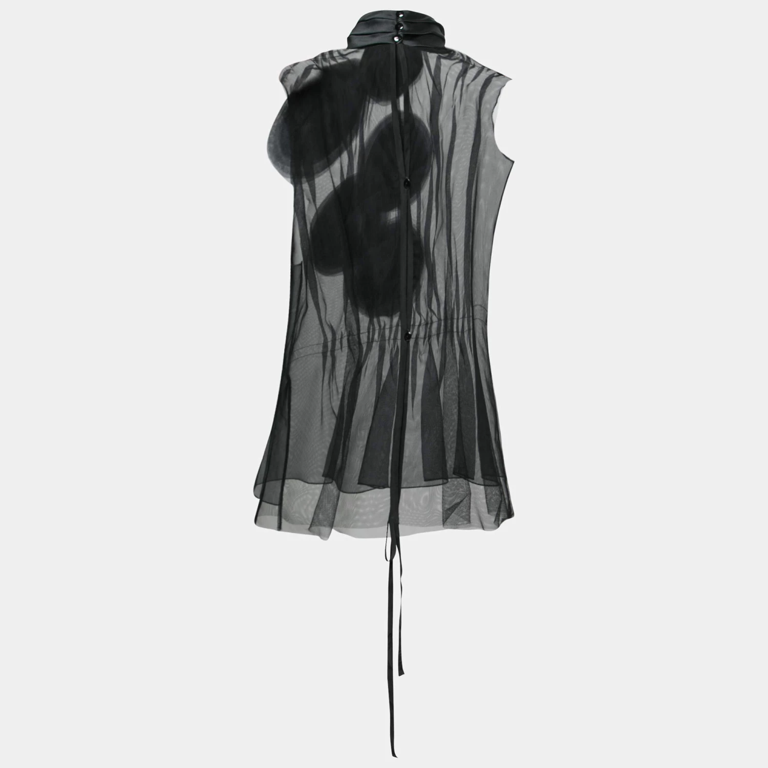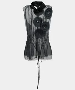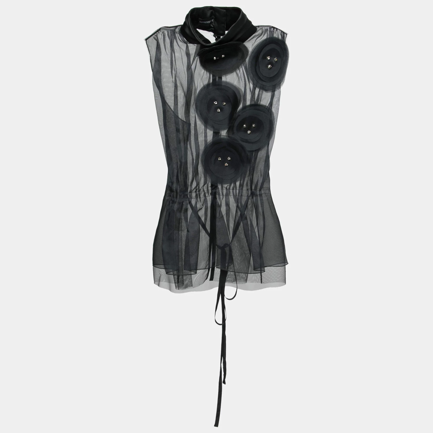 This top from Emporio Armani is going to be your favorite. With its stunning floral appliques and sheer black tulle silhouette, this top grants you all the party vibes! This top is equipped with buttoned closures.
