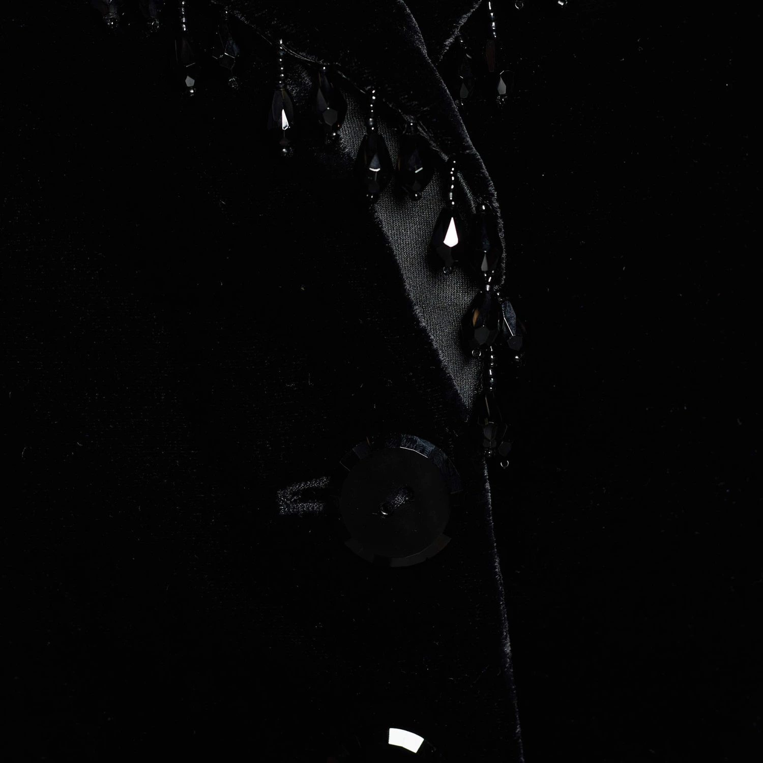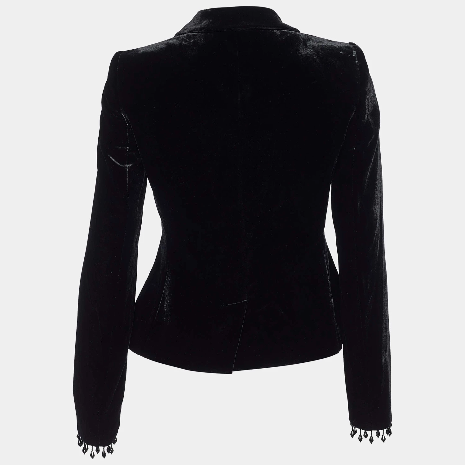 Create a statement look by wearing this stunning blazer from Emporio Armani. This comfortable and stylish black blazer is designed from velvet and features a smart silhouette with bead-tasseled detailing, long sleeves, and pockets. Use this appealing and posh creation to flaunt your look.