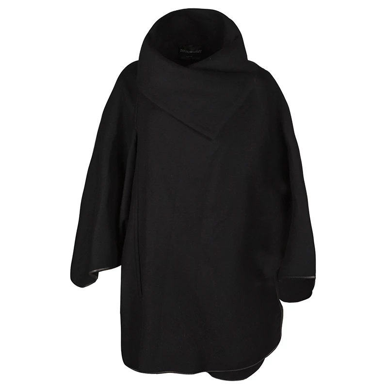 Create a distinct winter look that is sure to stand out with this Emporio Armani cape style over coat. Constructed in black wool and cashmere blended fabric, this coat features a high neckline with a wrap around front and black leather trimming for an interesting look.