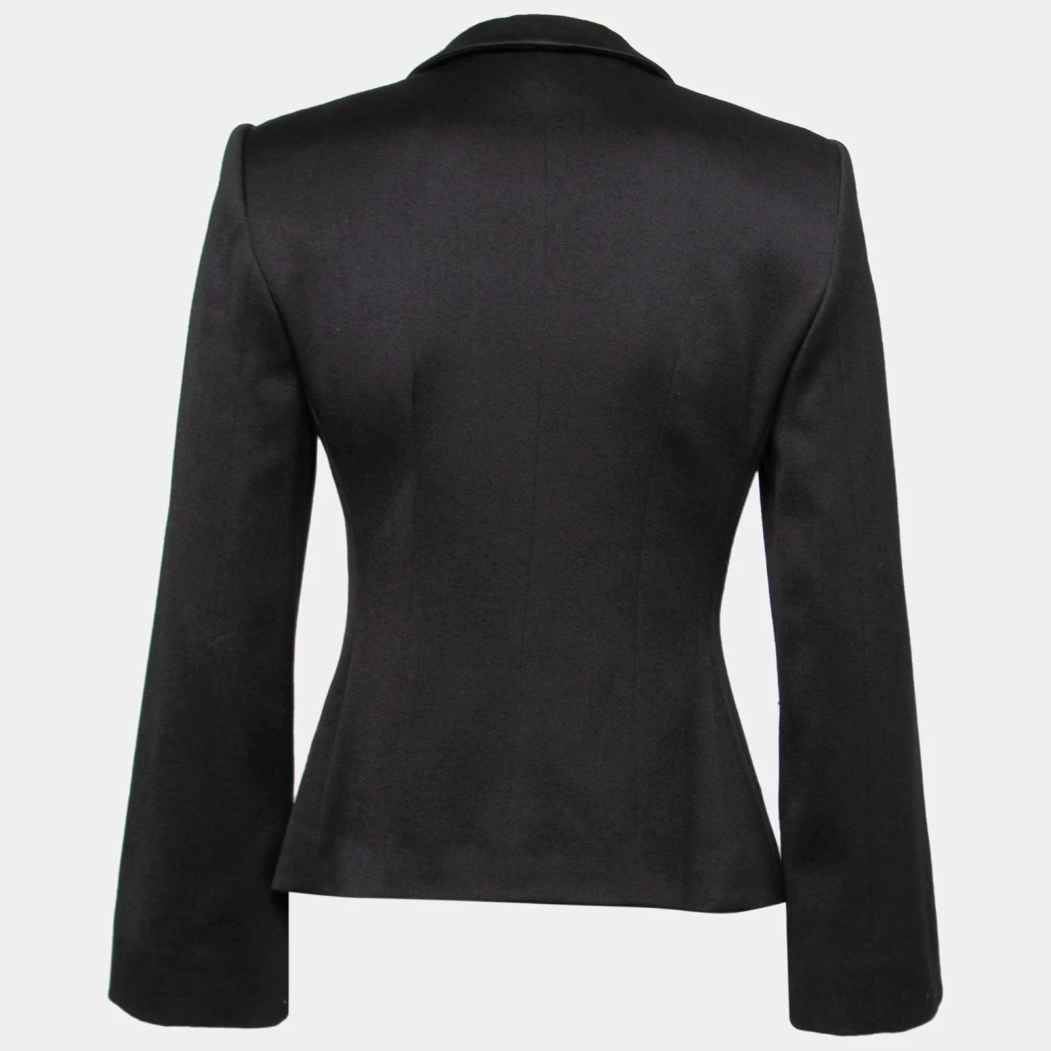This blazer from Emporio Armani is the perfect pick to look stylish and sophisticated. It is fashioned in black wool fabric into a single-breasted silhouette. It exhibits buttoned closures and long sleeves. Make your formal outfit more appealing with this Emporio Armani blazer.