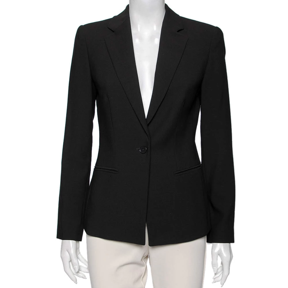Exude charm and sophistication as you wear this blazer from the House of Emporio Armani. It is tailored using black wool fabric into a single-breasted silhouette. It features long sleeves with buttoned cuffs, buttoned closure, and two external pockets. Enhance your formal wear with this super stylish blazer.