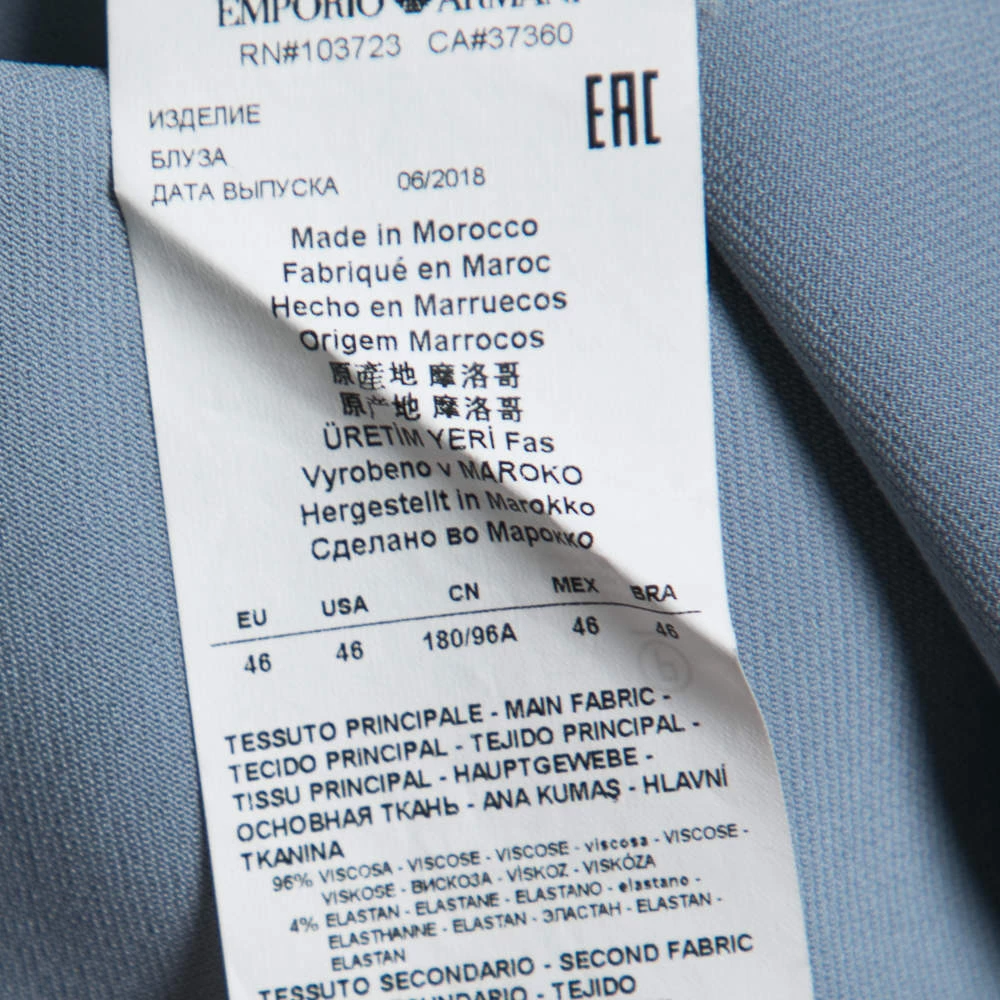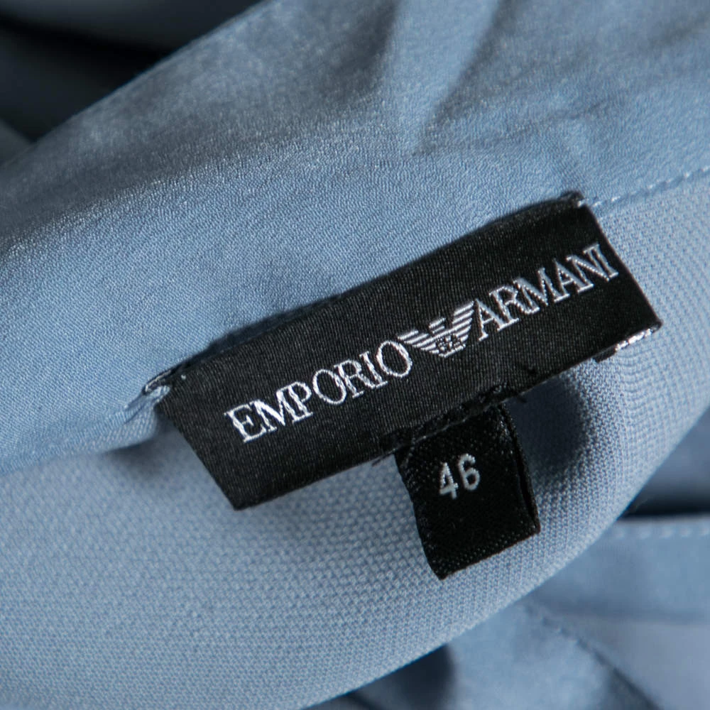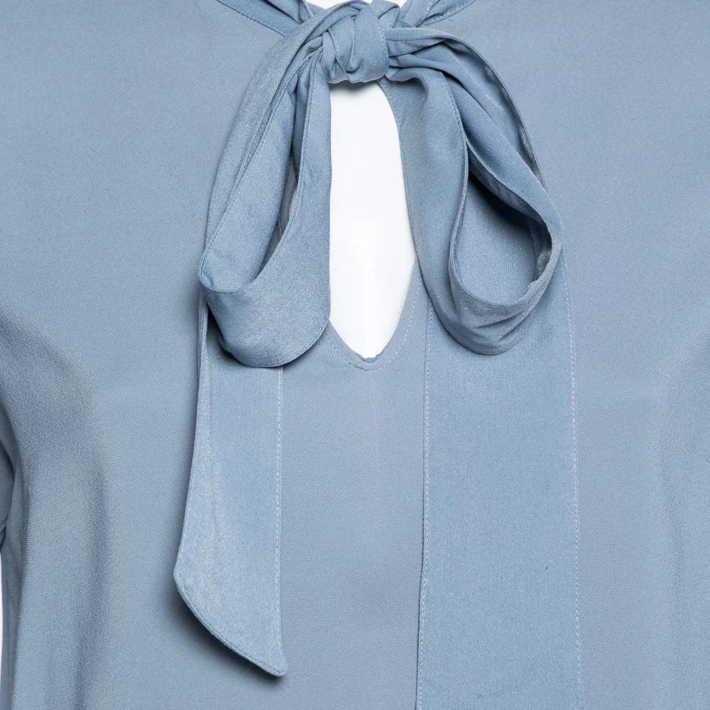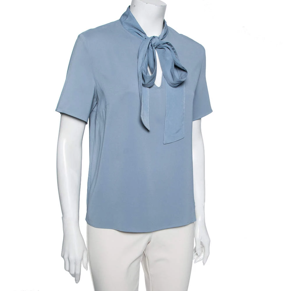 This light blouse from Emporio Armani is simple and fashionable. It comes in a blue tone with short sleeves, a straight hemline, and a tie-detailed neckline. It can be worn with tailored trousers, jeans or skirts.