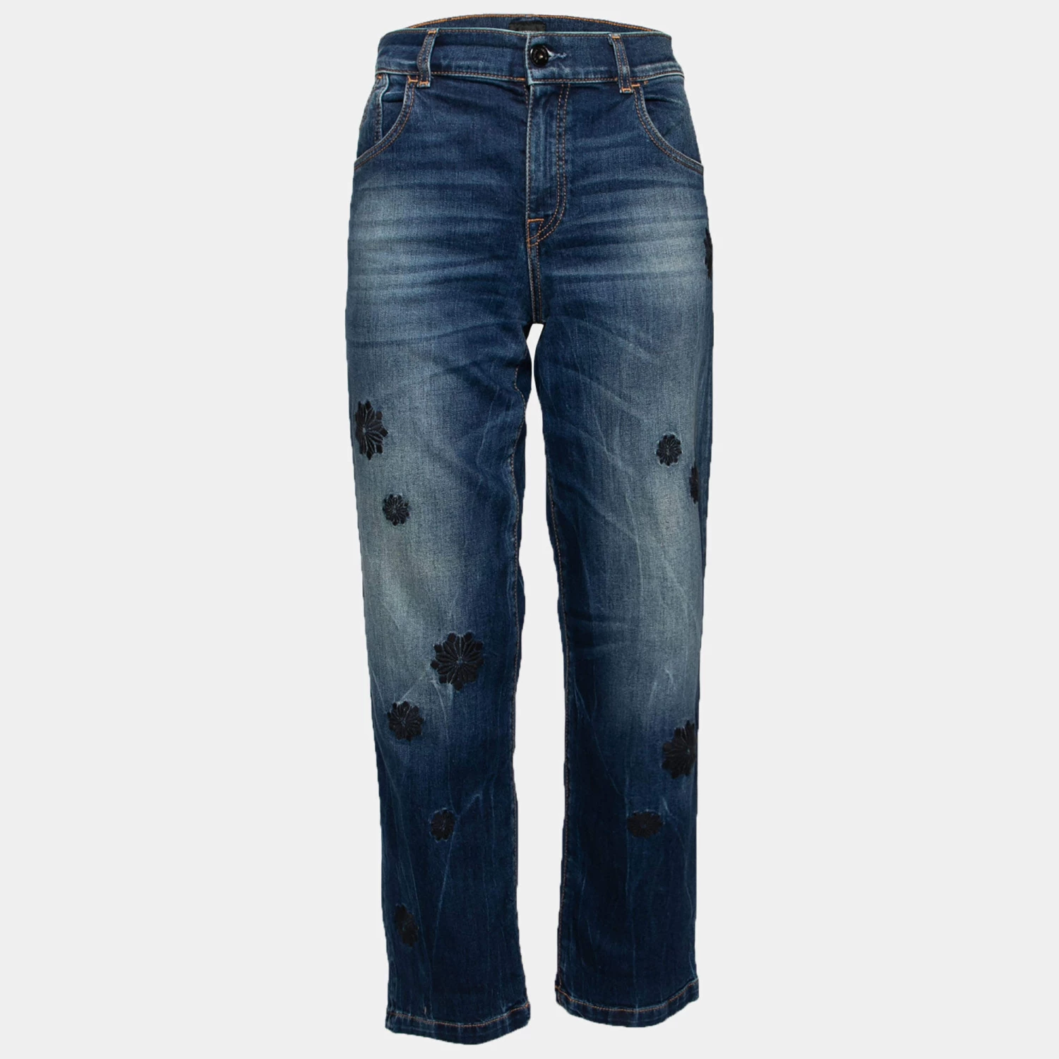 These jeans from Emporio Armani are a classy pair to own! They are created using blue denim fabric, which is highlighted with floral embroidery. They are provided with a buttoned closure on the front. Put on these jeans and achieve a trendy casual style.
