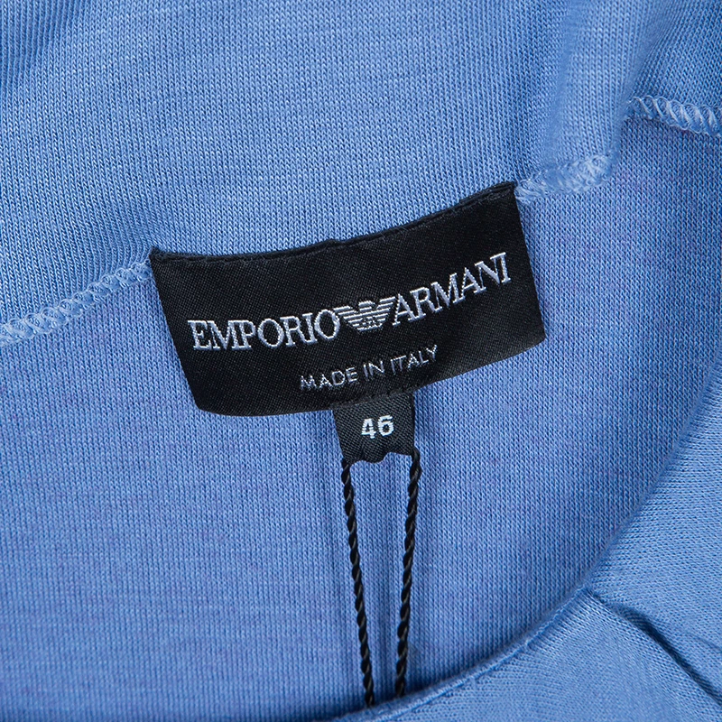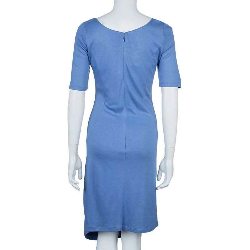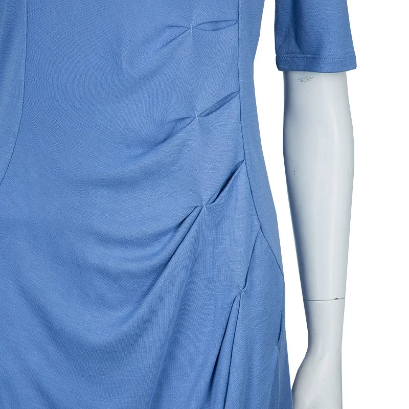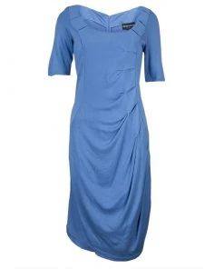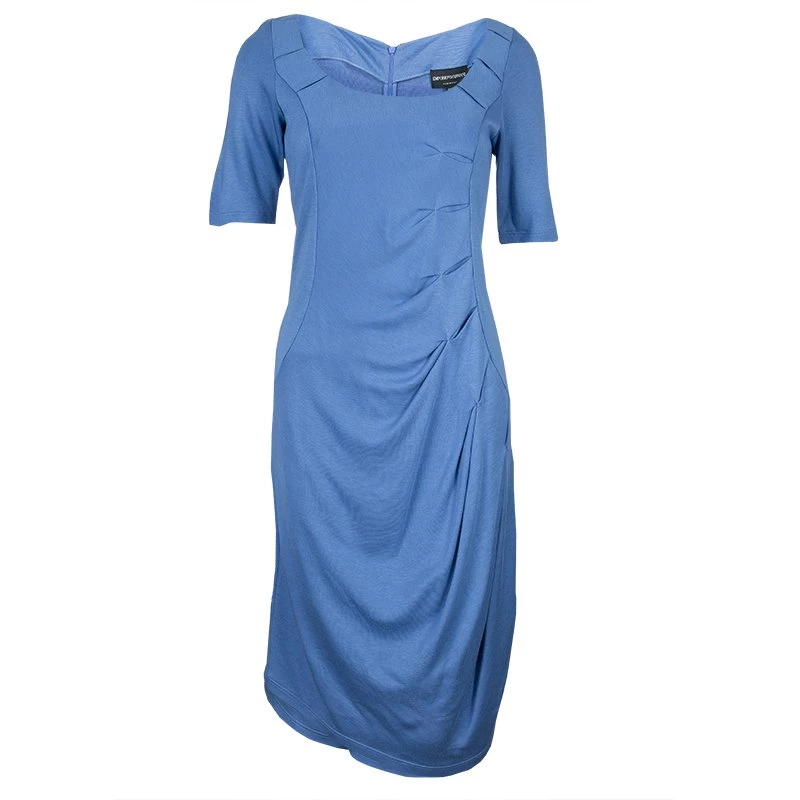 Emporio Armani indulges in exquisite fabrication and exclusive designing while featuring dresses such as this. This blue attire has been crafted from a blend of viscose and wool with a hint of polyamide. The half sleeve is designed in a ruched pattern which enhances the sense of flare through the length. This knee length dress closes at the back with a zip enclosure and has been designed to elegantly fit true to your size.