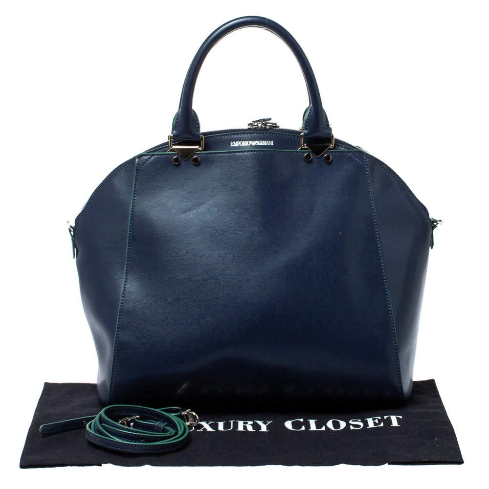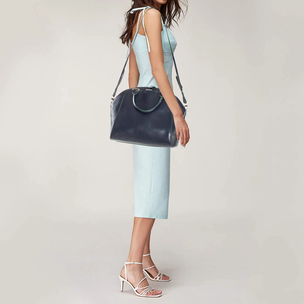 Stylish and easy to carry, this leather satchel is simply a must-have for your wardrobe upgrade. Lined with canvas, this bag can easily fit in all your essentials. Carry this Emporio Armani handbag and step out like a modern-day fashionista. Complement your ensemble by carrying it by the dual handles.