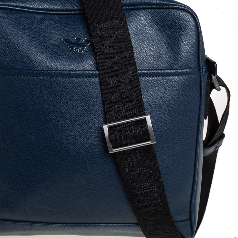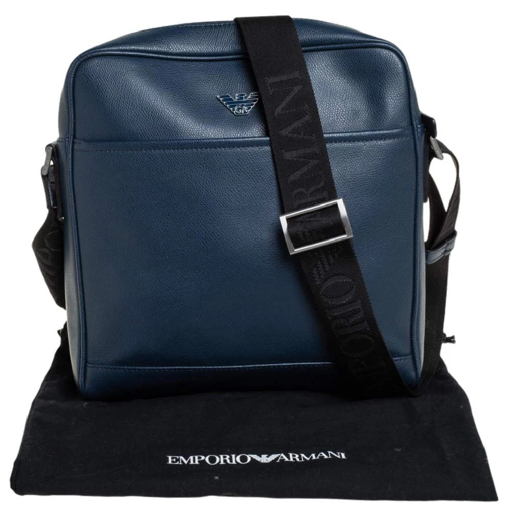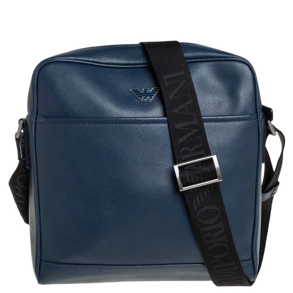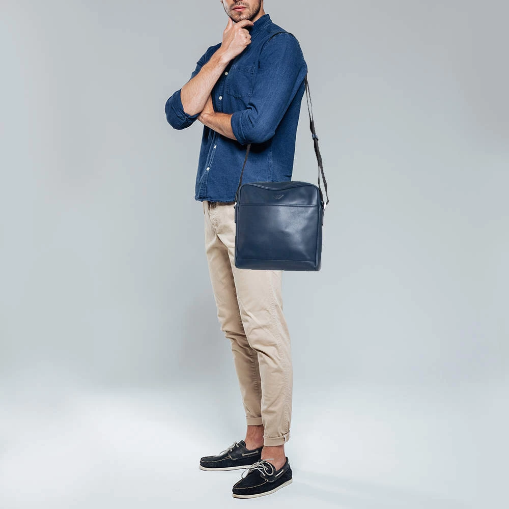 Crafted from fine leather, this Emporio Armani messenger bag is perfect for everyday use. Its exterior carries a blue hue and a slip pocket at the front. It has an adjustable shoulder strap with silver-tone hardware. The interior is lined with fabric.