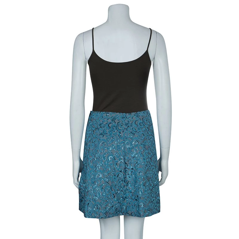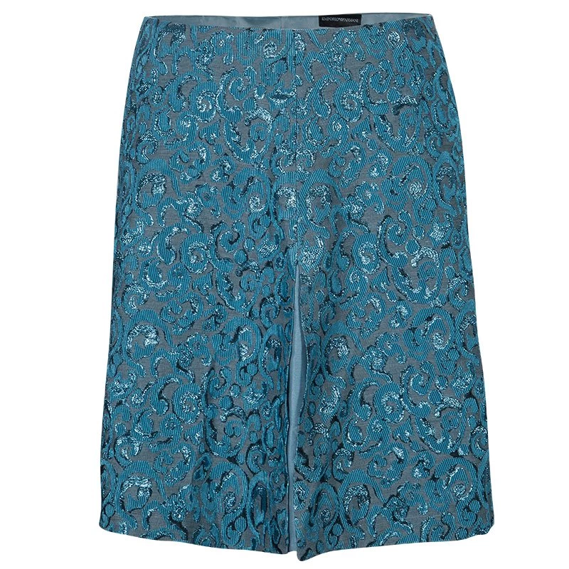 A fine weave skirt by Emporio Armani, this design is cut from a blend of acetate, polyester and acrylic. It’s finest feature is the jacquard woven-in design in metallic blue.