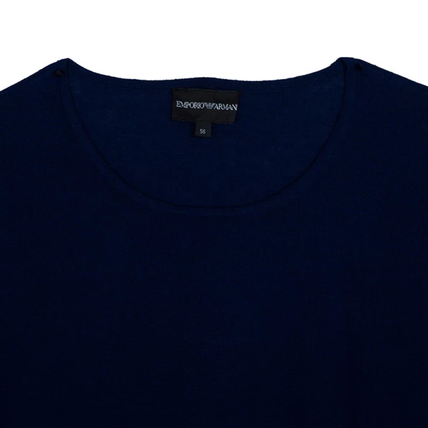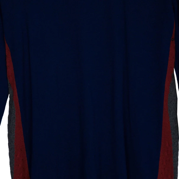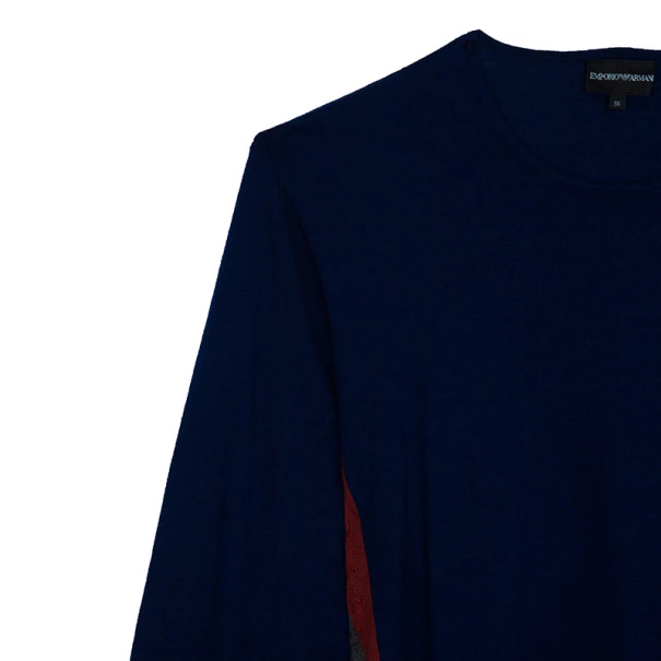 Keep it casual with this Emporio Armani sweater. Made from silk and wool, its blue color is coupled with grey and red stripes on its sides. It features a round neckline and long sleeves.Original Retail Price: US $465