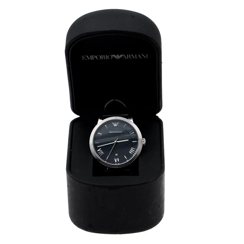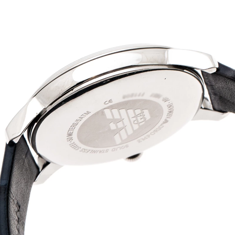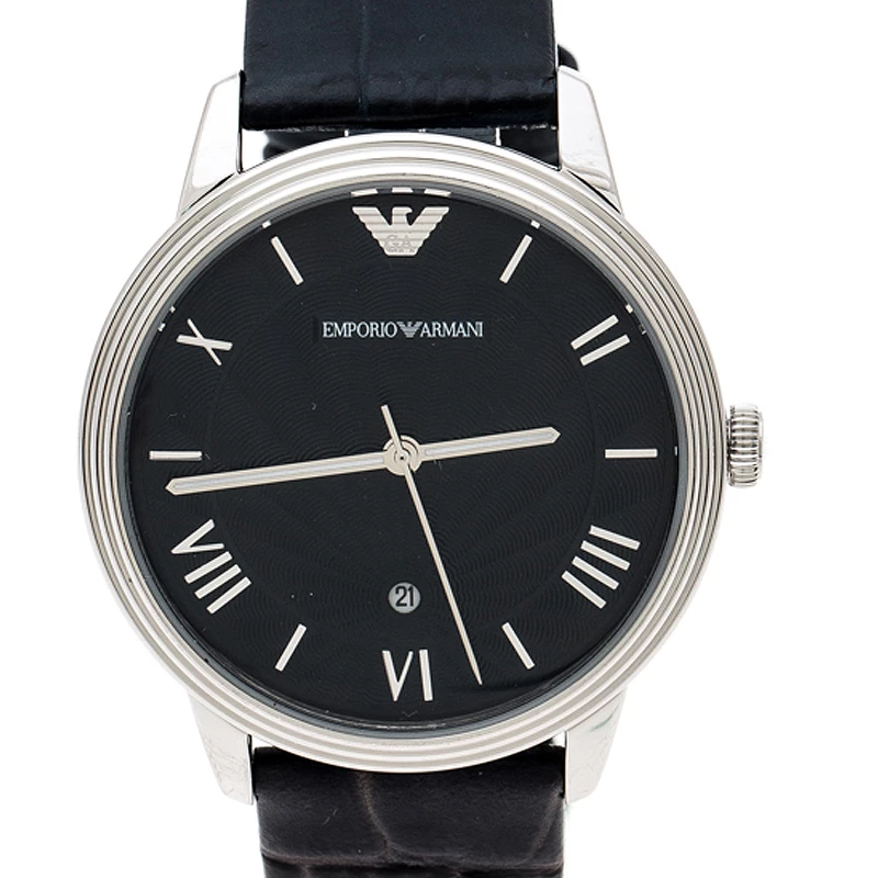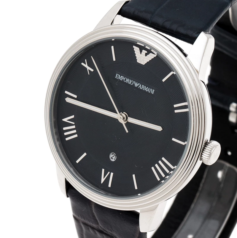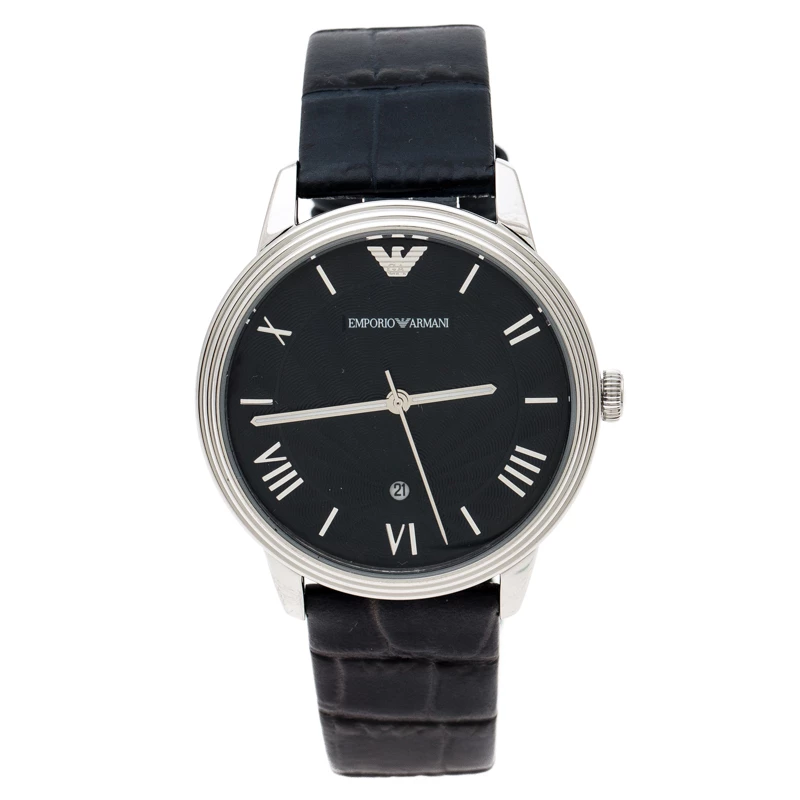 The case of this luxe wristwatch is made from stainless steel and held by embossed leather straps. The blue dial is textured and fixed with index and Roman numeral hour markers, a date aperture and the brand logo. The quartz watch has a smooth bezel and can be fastened to your wrist using the buckle clasp.