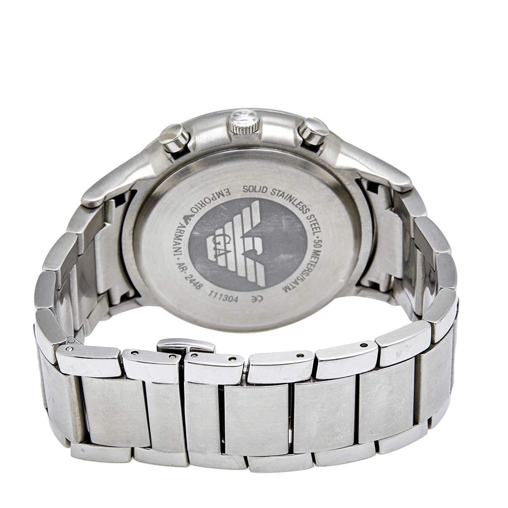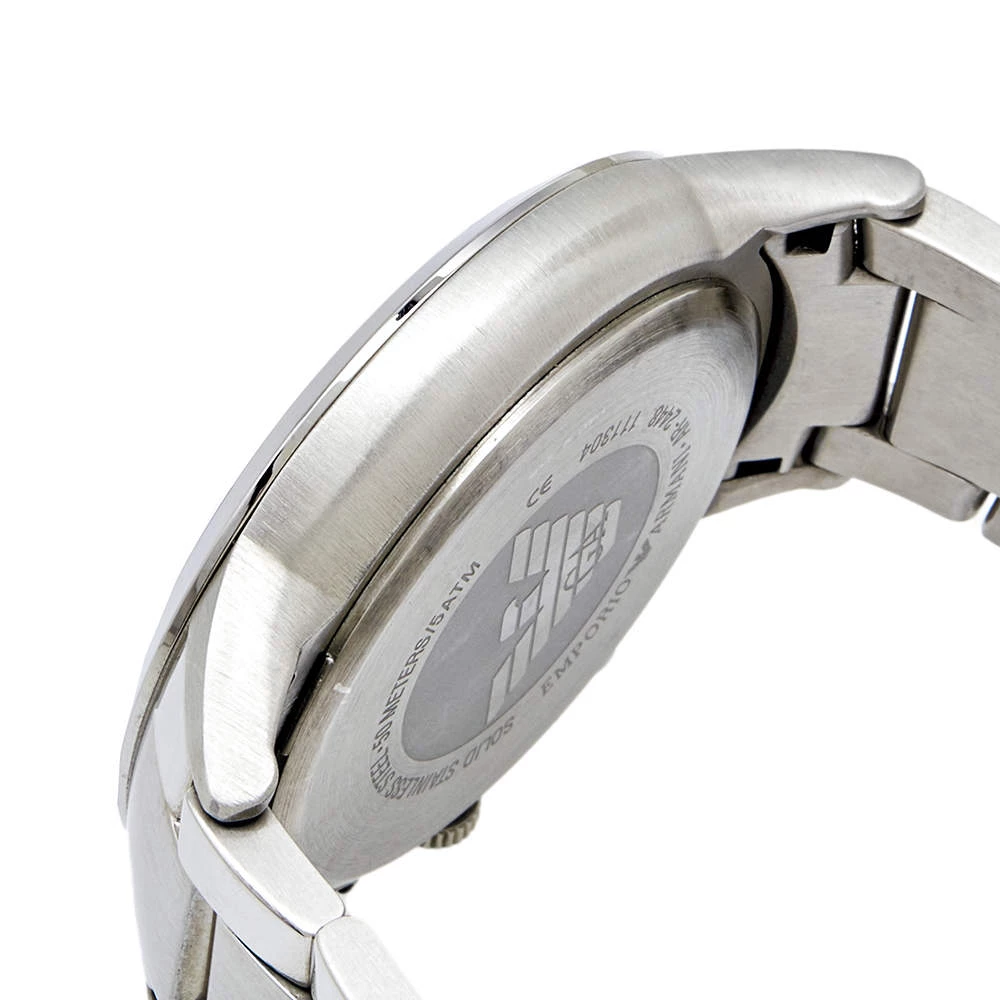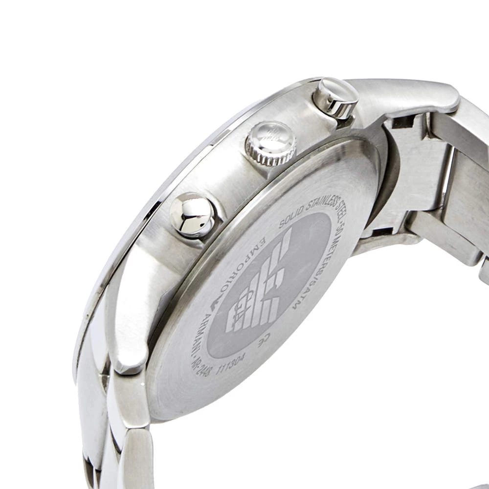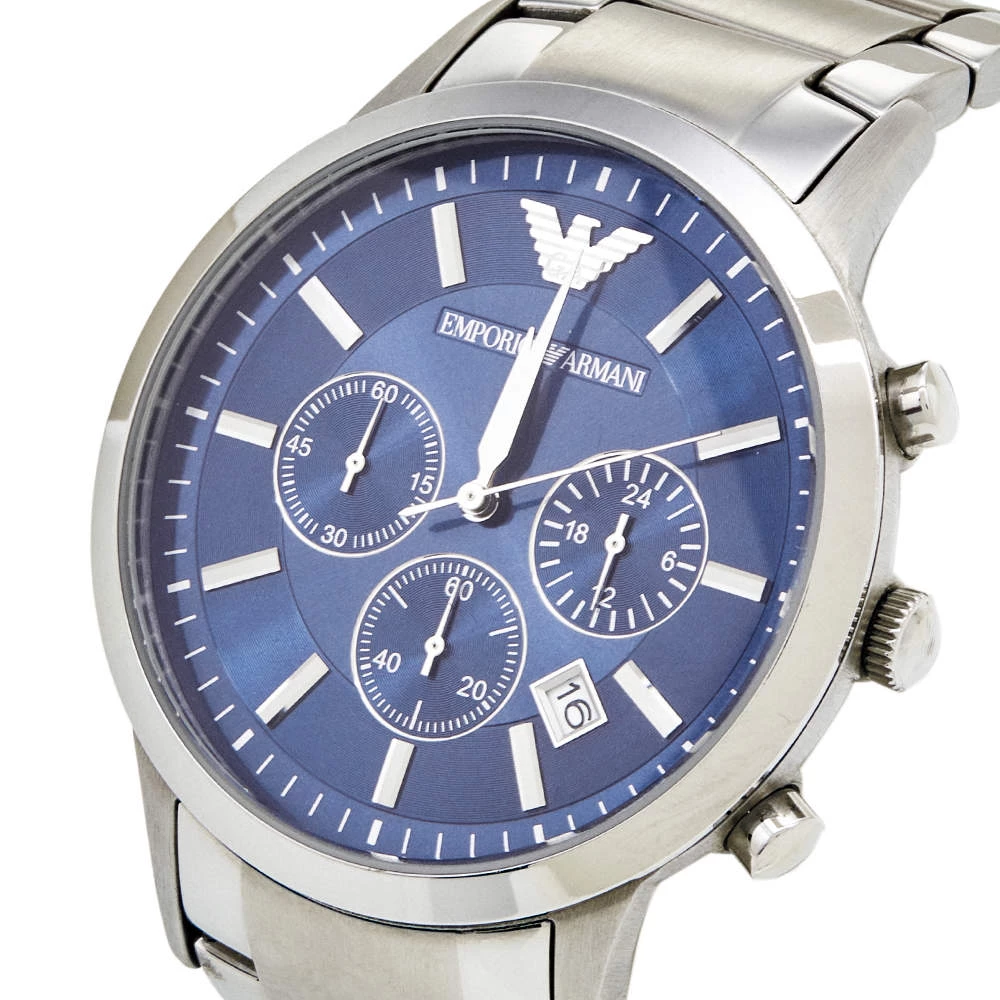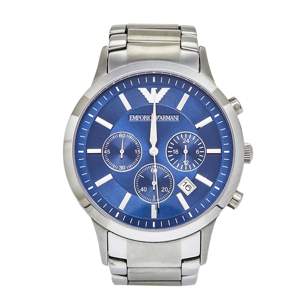 This Emporio Armani watch features a stainless steel body with a 43 MM case. Designed to be ideal for everyday use, the quartz / chronograph watch comes fitted with a blue dial and a simple clasp to the comfortable bracelet.
