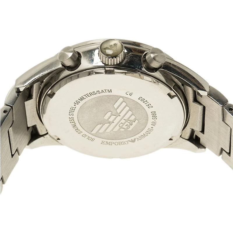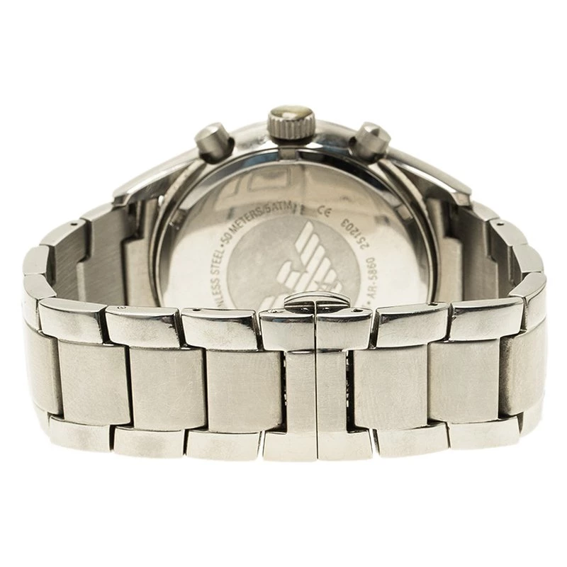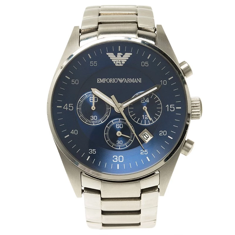 This Emporio Armani’s AR5860 watch is a classic timepiece. Its stainless steel case holds round and smooth bezel. Its bold design comes with a blue dial featuring a date window, luminous hands, and three subdials. This luxurious watch has a 30M water resistance level and a quartz movement. Its chain bracelet is equipped with a hidden closure.