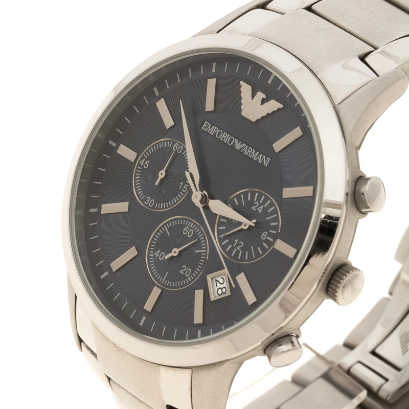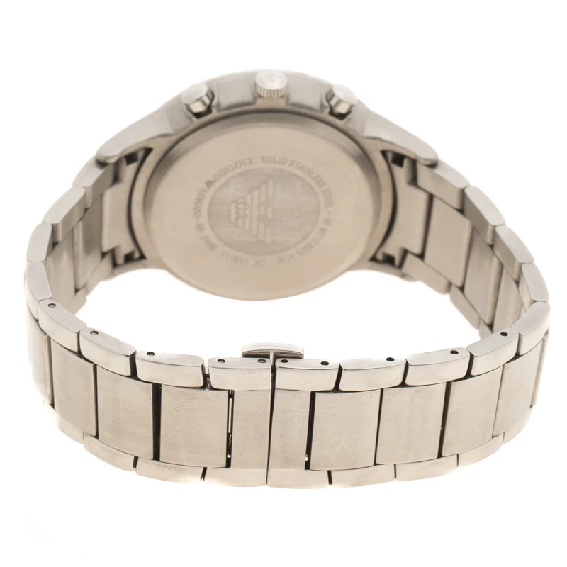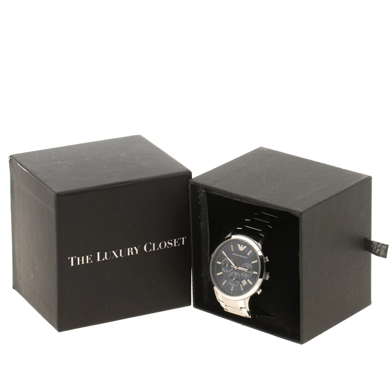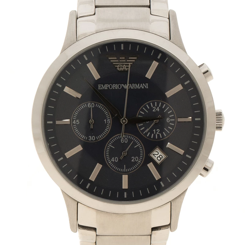 This timepiece is a unique creation for the modern men. Crafted from stainless steel, it features a round stainless steel case with a blue dial. It comes with sleek silver hands, baton hour markers and sub dials enabling its chronograph capabilities. This 50m resistant watch fixes on a wrist with a stainless steel bracelet and deployant clasp.