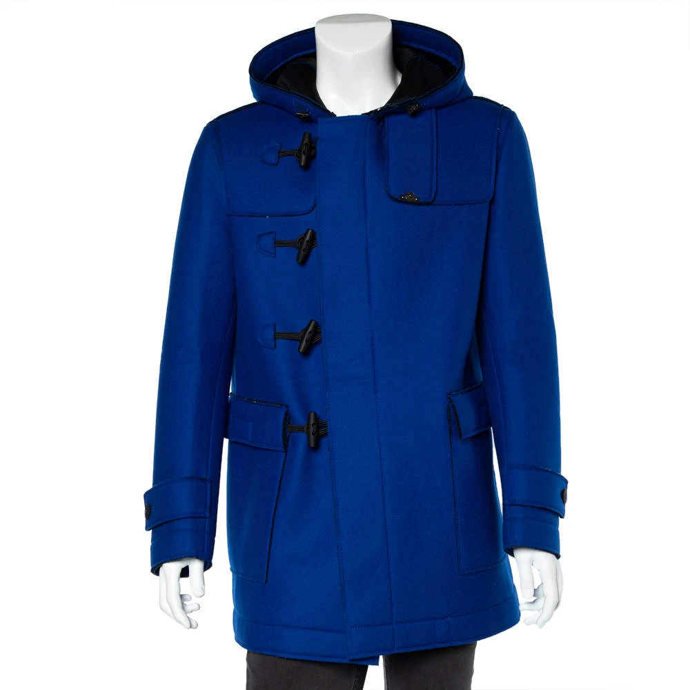 A coat to wear and treasure for years is this one in blue from Emporio Armani. It is made from mesh and wool and designed with toggle buttons on the front. The hooded coat is not just well-tailored or appealing, it is also stylish and comfortable.