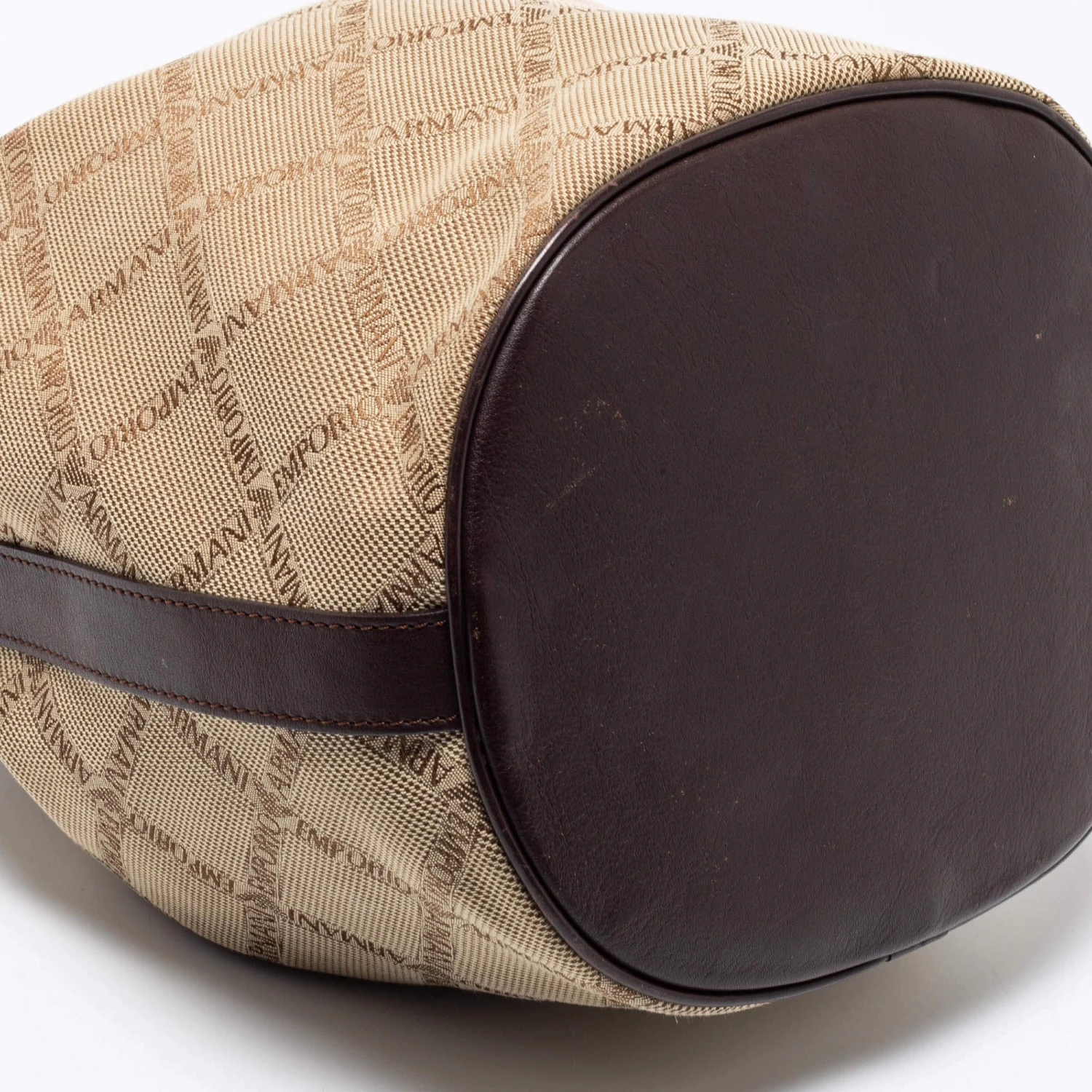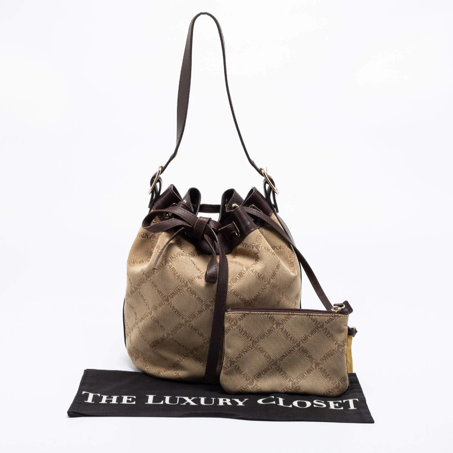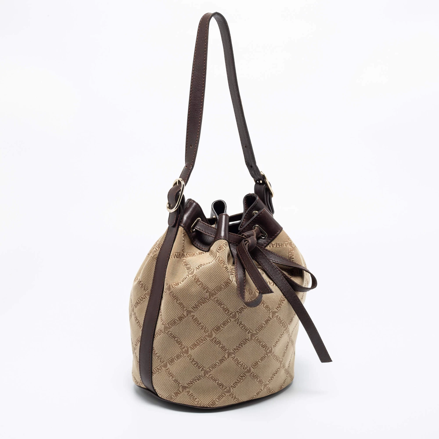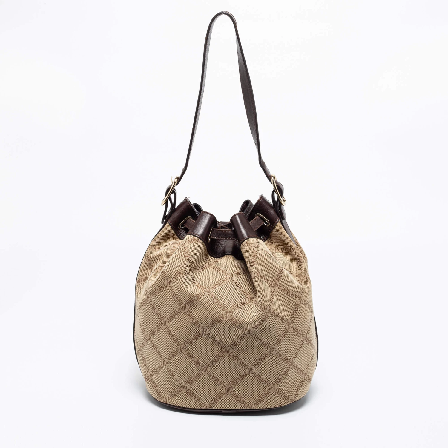 This classy, functional Emporio Armani bucket bag presents itself in signature fabric and leather, secured by a drawstring. Carry your everyday essentials in the fabric-lined interior of this bag.`