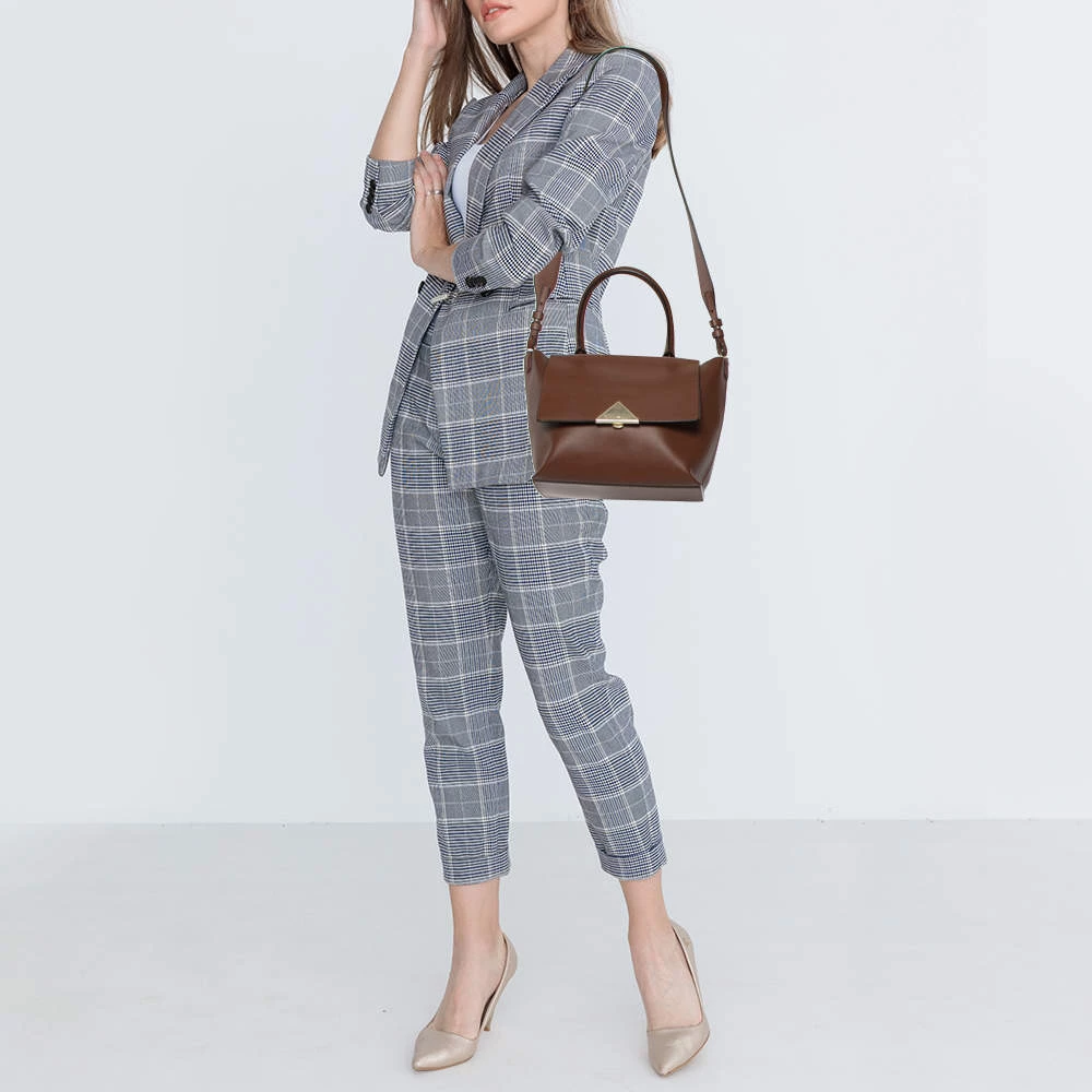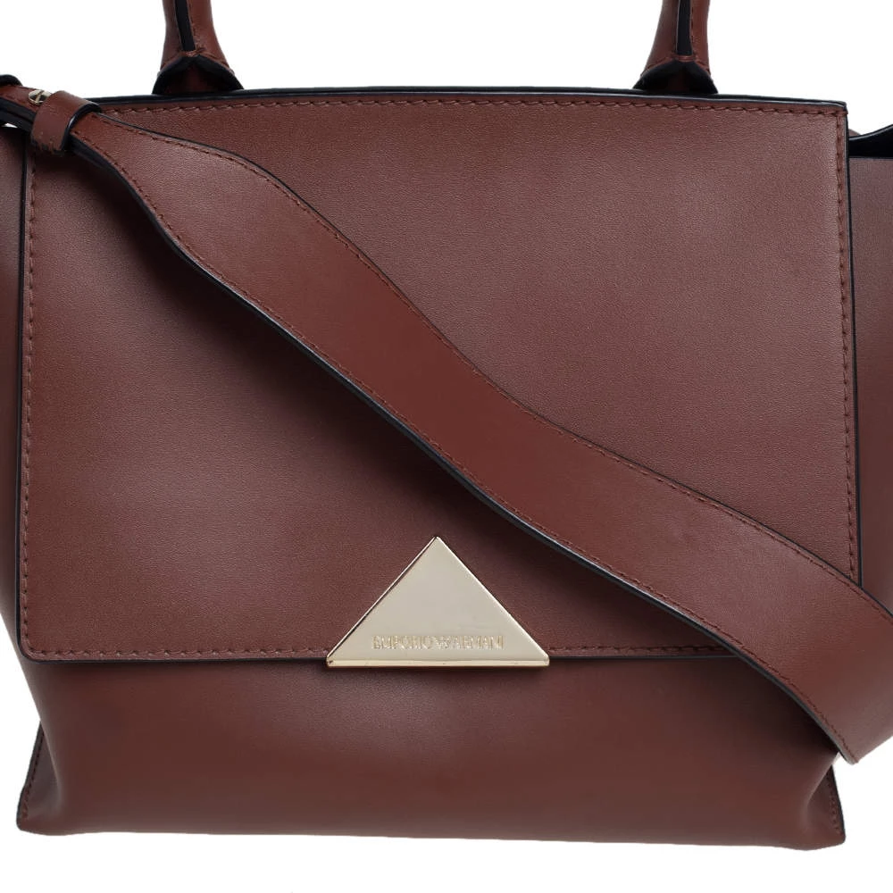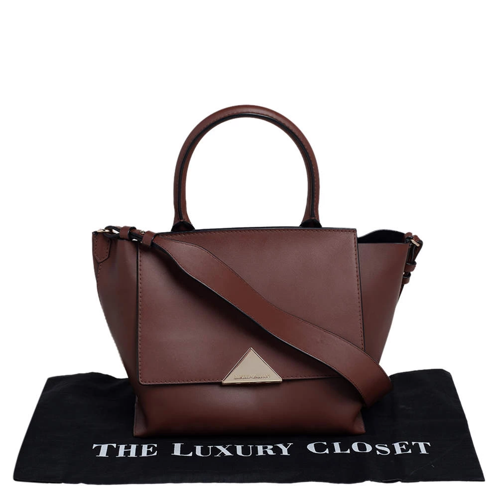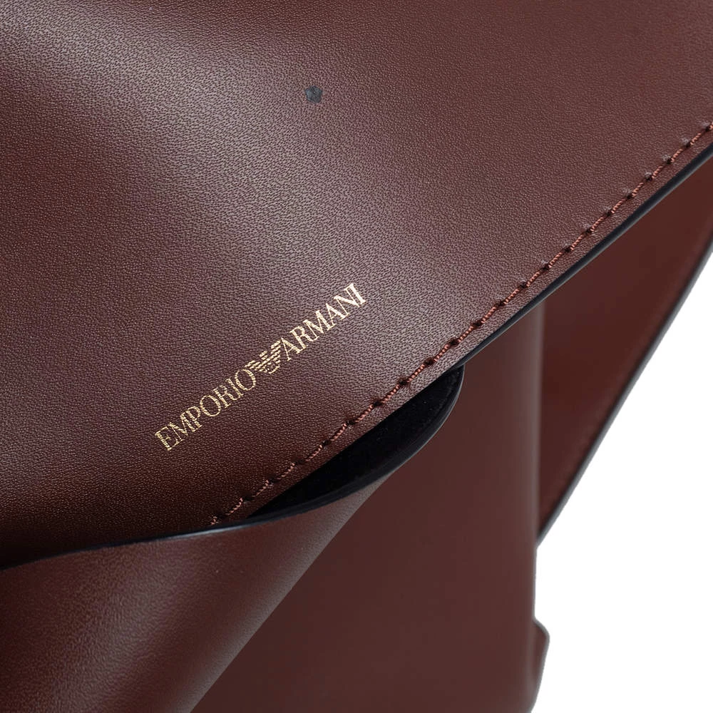This top handle bag by Emporio Armani will make a great addition to your designer handbag collection. It flaunts a classy brown leather exterior and is apt for formal use. This Emporio Armani bag is definitely worth the investment.