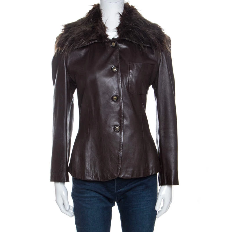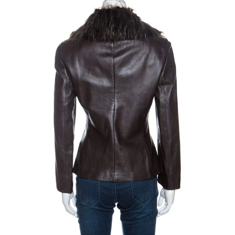 This vintage jacket by Emporio Armani is great for special occasions. Crafted from 100% leather, it comes in brown. It is styled with a fur collar, button closure, a front pocket, long sleeves and has been cut to offer a good fit. Grab this now!