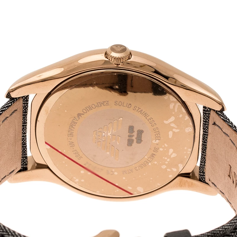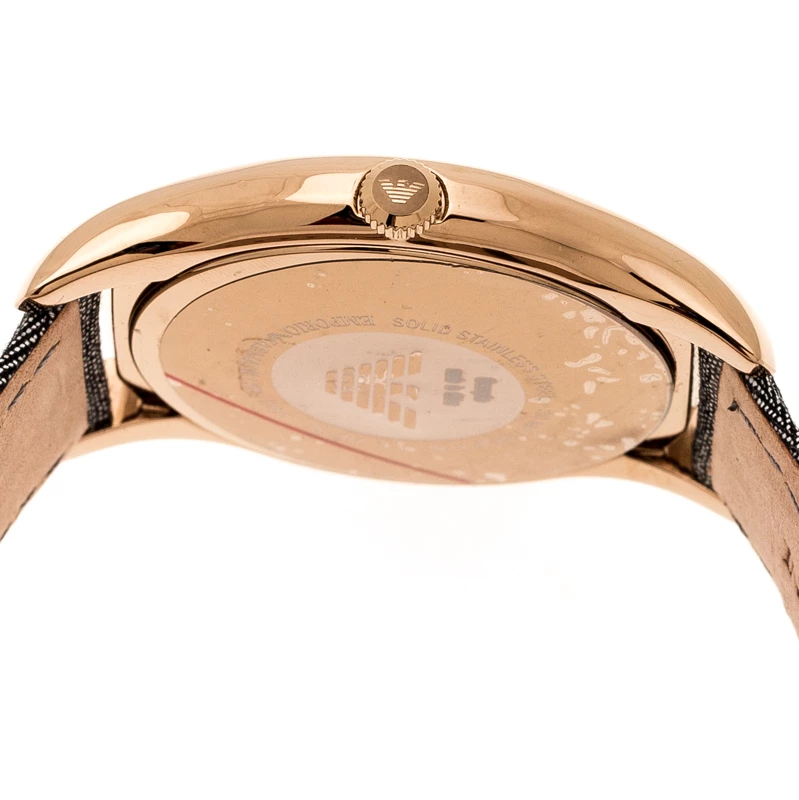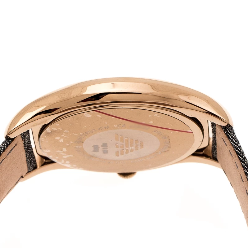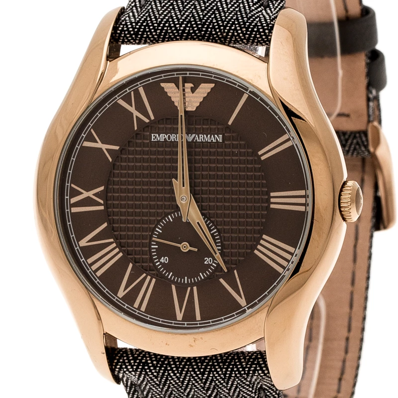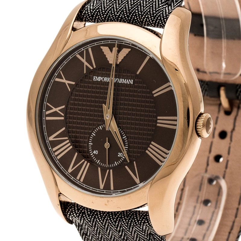 This timepiece is a unique creation for the modern man. Crafted from bronze PVD coated stainless steel, it features a round case with a textured brown dial housing two arms and Roman numerals. The subdial enables its chronograph capabilities. The Emporio Armani logo at 12 o’ clock position gives the watch a signature finish. This 30m resistant timepiece fixes on your wrist with grey fabric straps and a buckle closure.