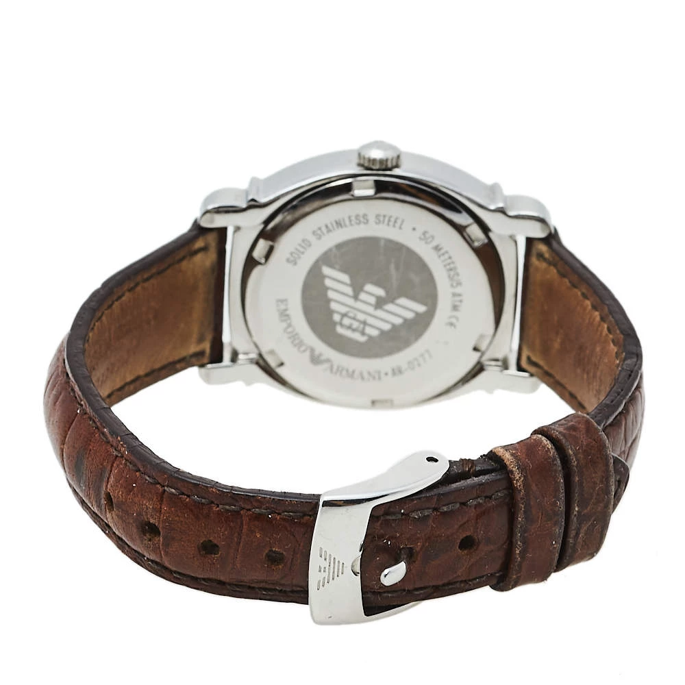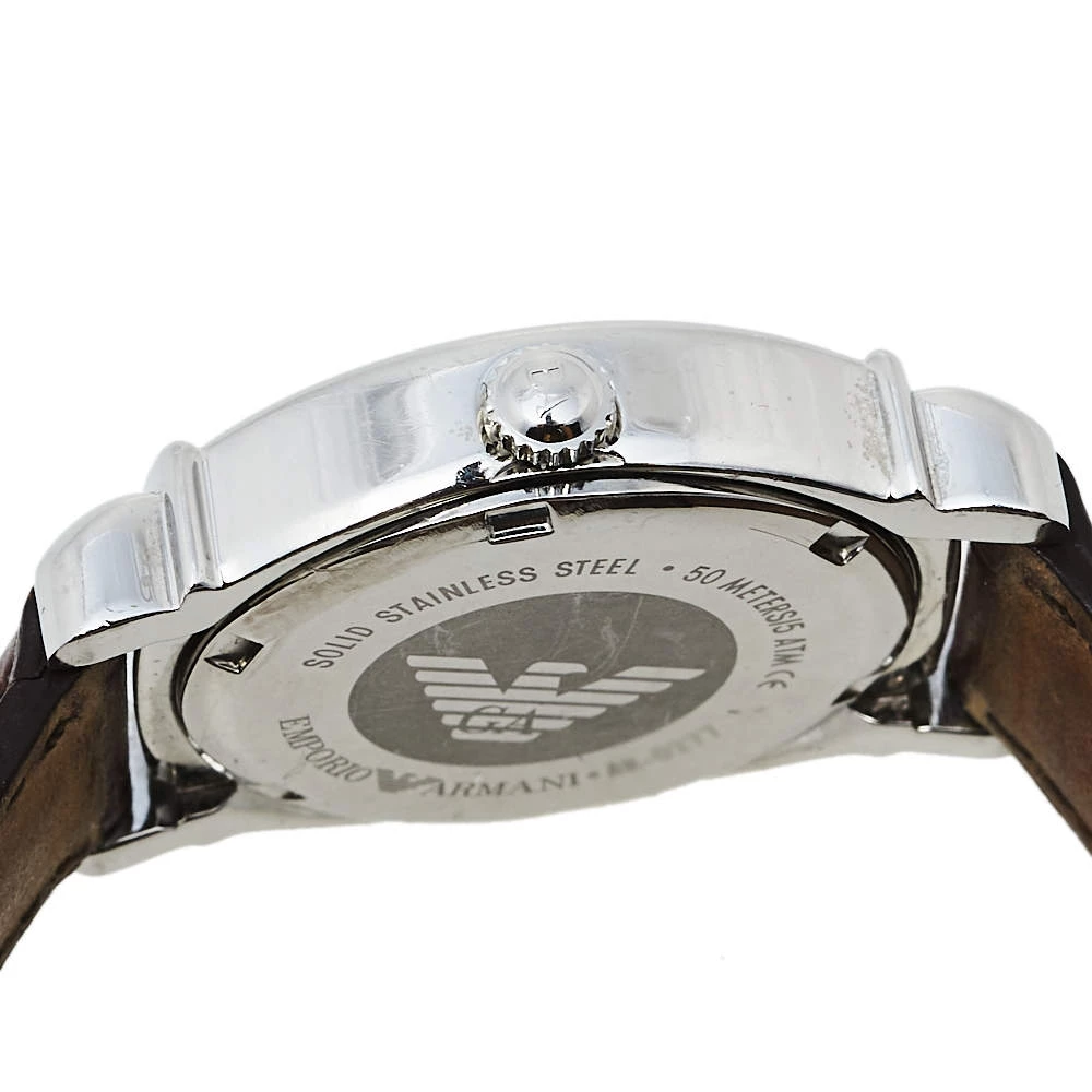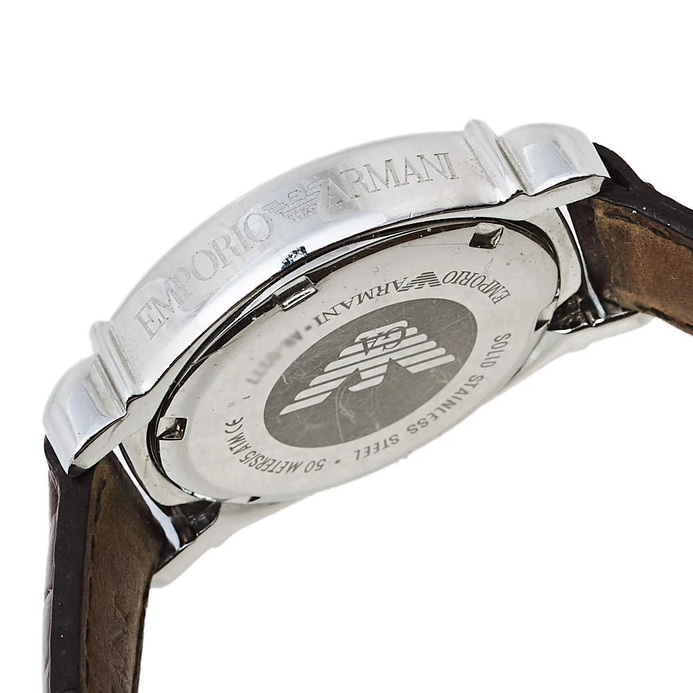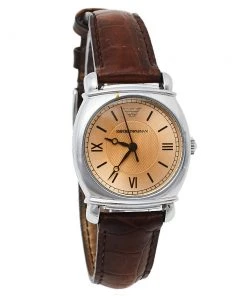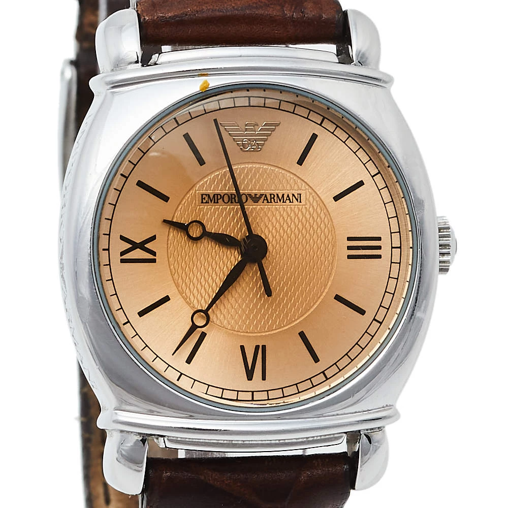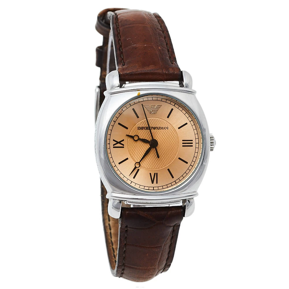 This Emporio Armani Quartz wristwatch brings a clean, stylish design. The stainless steel case holds a fixed bezel and brown dial set with stick and Roman numeral hour markers, brand detailing, and three hands. It comes with a leather bracelet secured with a buckle.