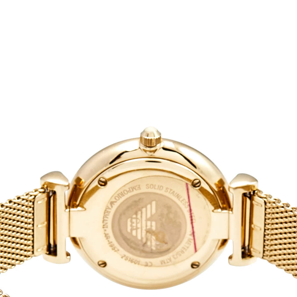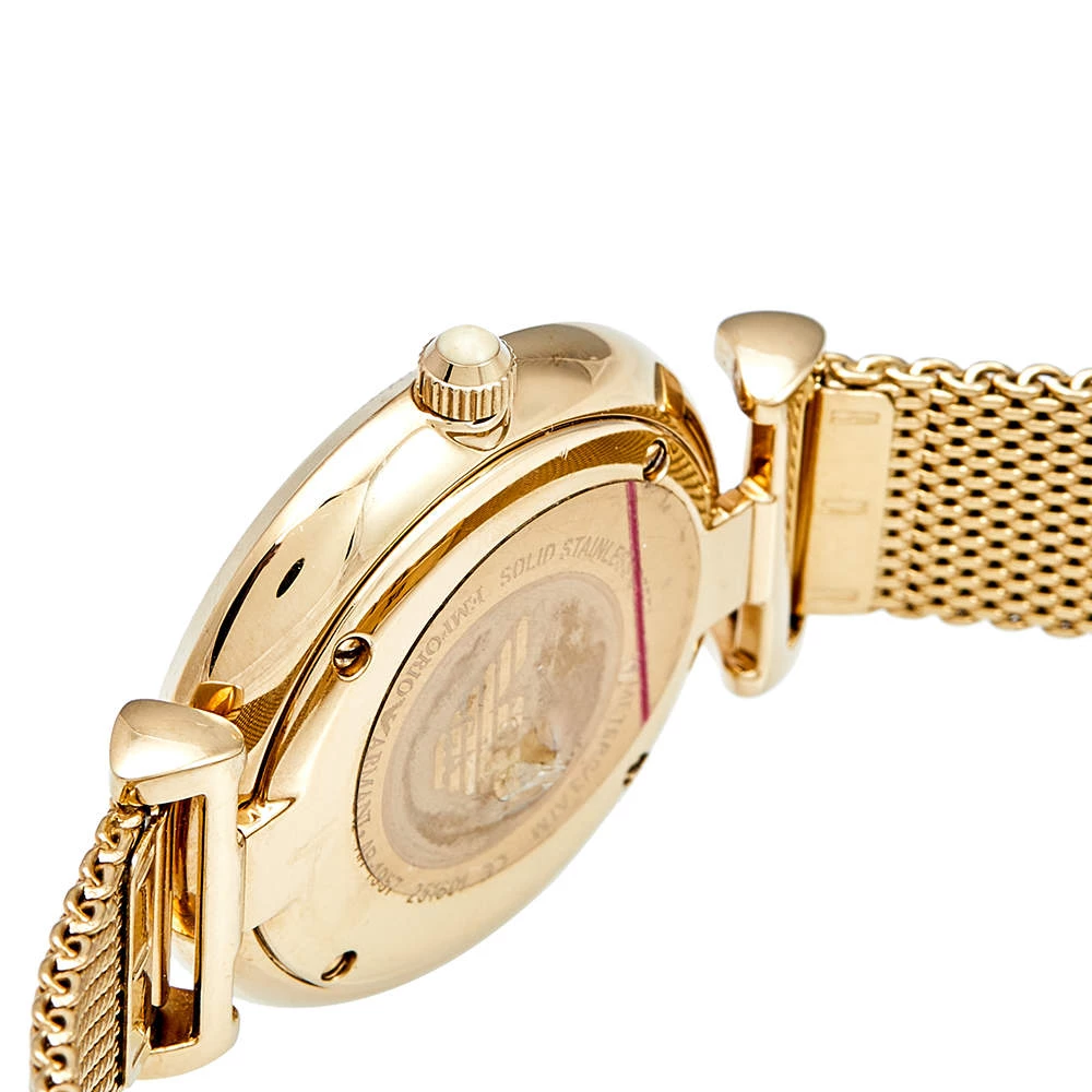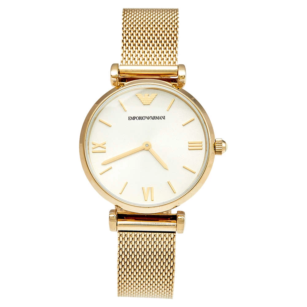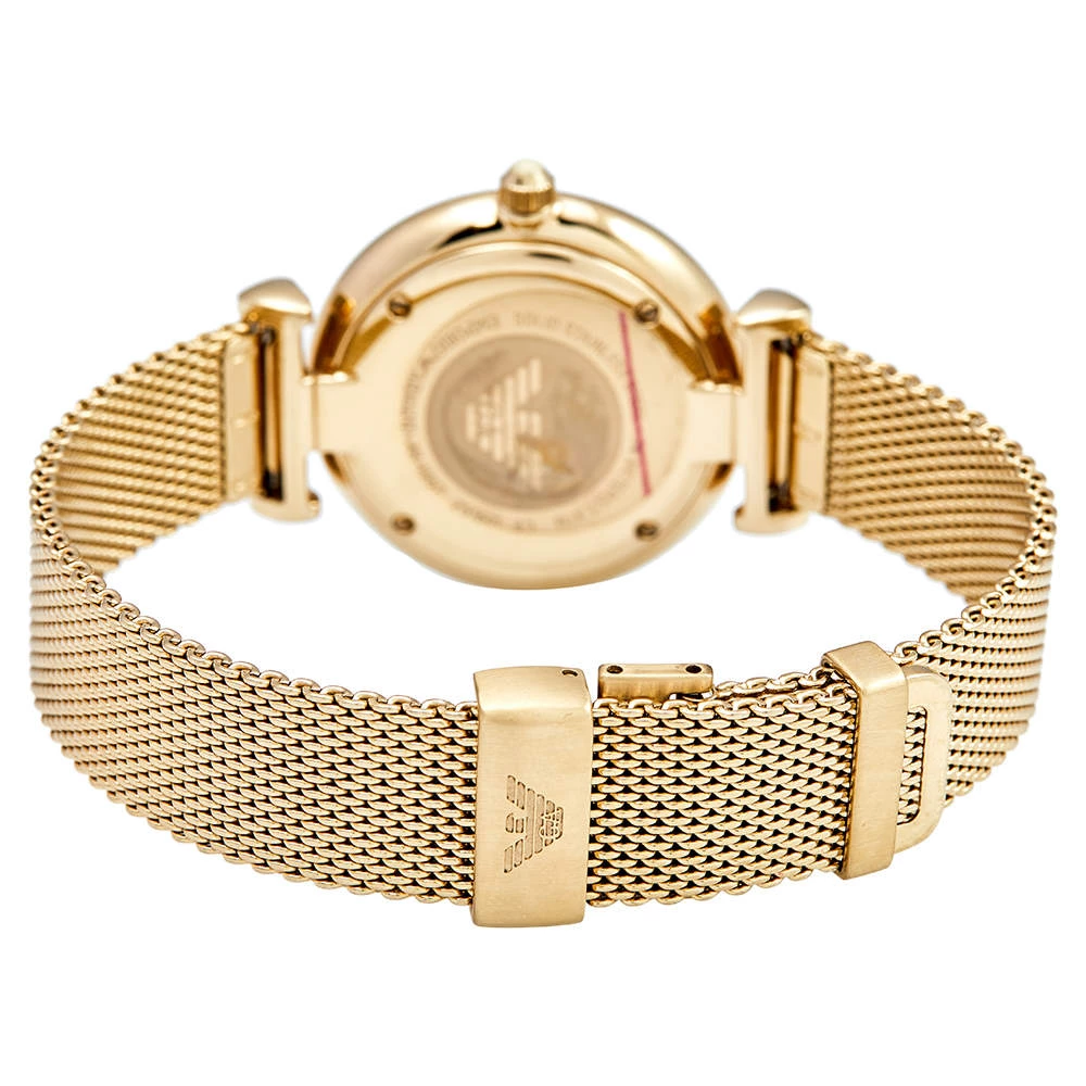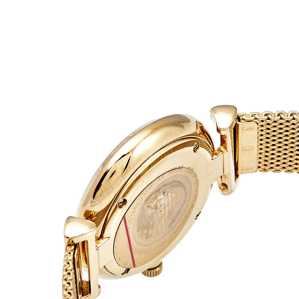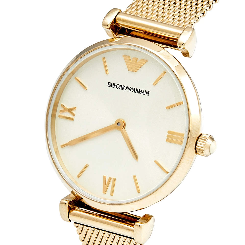 Let this Emporio Armani watch keep you on time and add to your everyday style. The gold-plated stainless steel case comes with a well-designed champagne dial flaunting index and Roman numeral hour markers, two hands, and the logo at the 12 o’clock position. It is complete with a mesh-like bracelet.