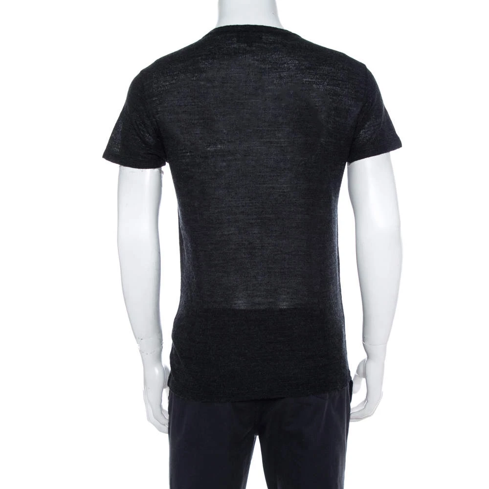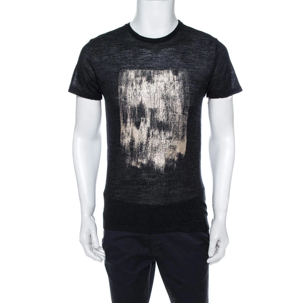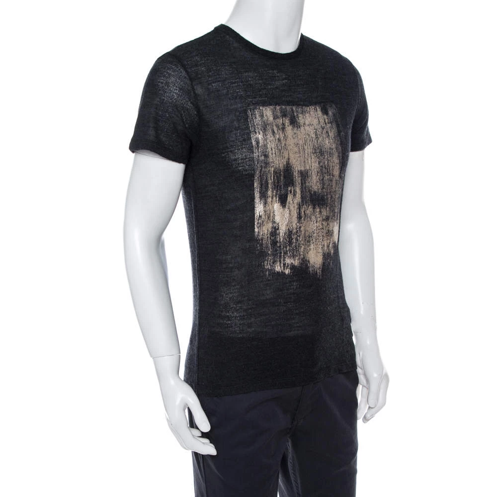 This stylish t-shirt by Emporio Armani is perfect for casual days. It has been crated from wool and carries a lovely shade of charcoal grey. It has been styled with short sleeves, gold-foil abstract print in the front, a rounded neckline and a good fit.