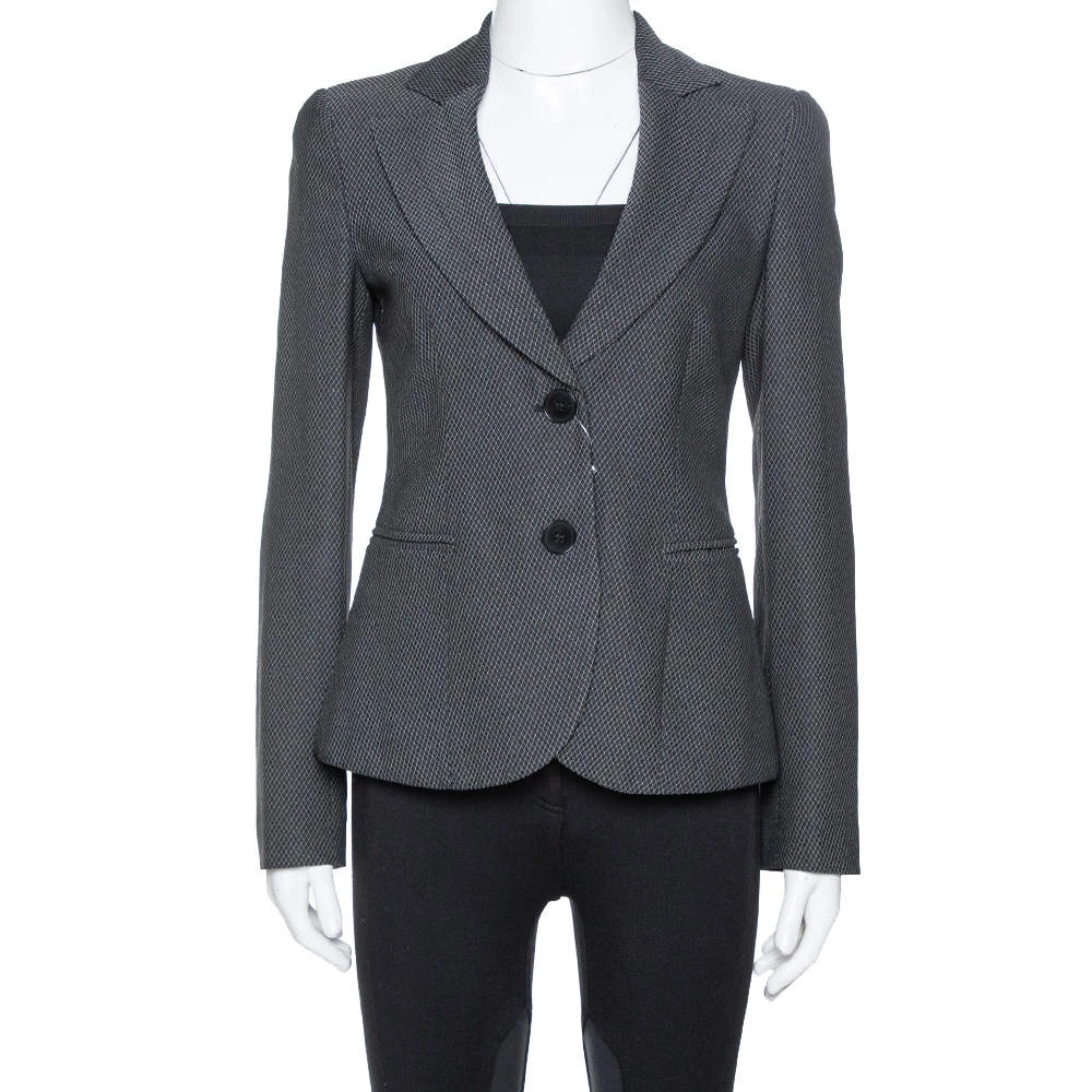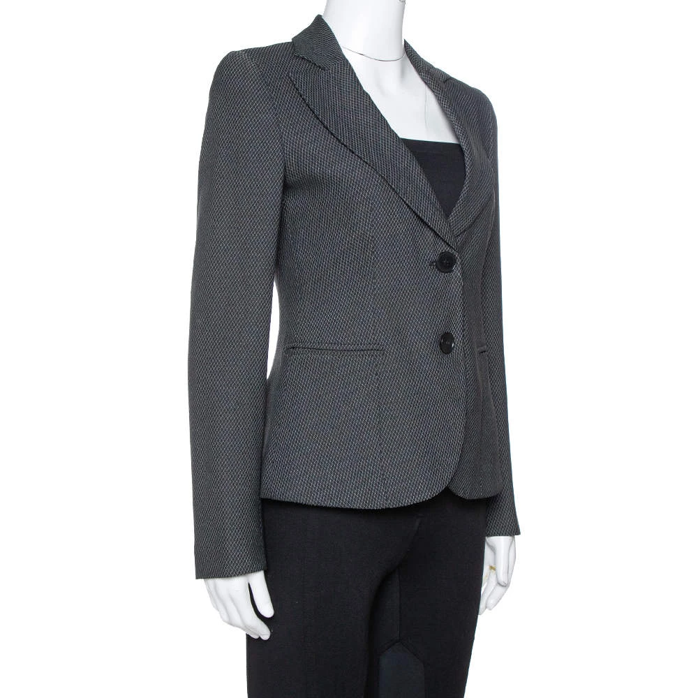 Ace your meetings wearing this blazer from Emporio Armani that exudes class and style. Made from fine-textured crepe, the charcoal grey shade makes it perfect for formal events. It features two external pockets, long sleeves, and is finished with a buttoned closure.