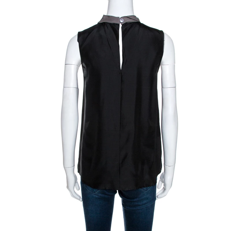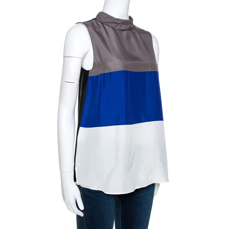 This stylish top by Emporio Armani is great for casual outings. Crafted from 100% silk, it has a stunning color block pattern. This sleeveless top is styled with a relaxed silhouette, a high neck, button closure and a good fit. Pair with jeans and you are good to go.
