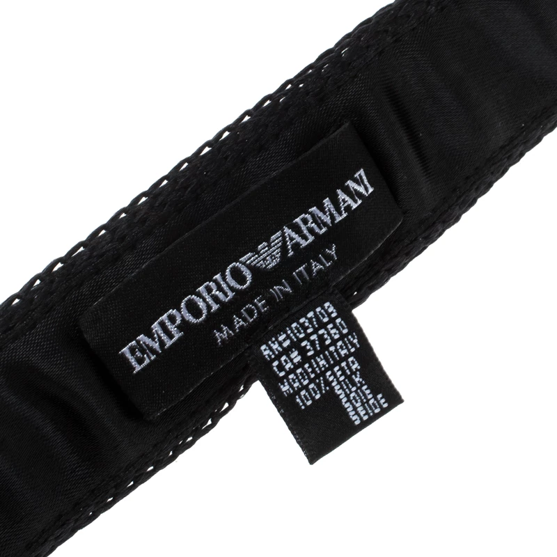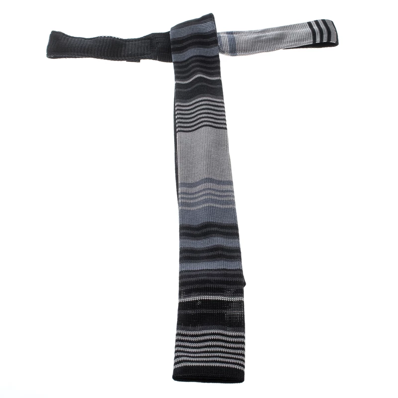 Here’s your chance to add a piece from Emporio Armani’s knitwear to your closet. The striped tie is knitted from silk and it has a flat bottom and the brand label on it. It can be an accessory to your formals as well as casuals.