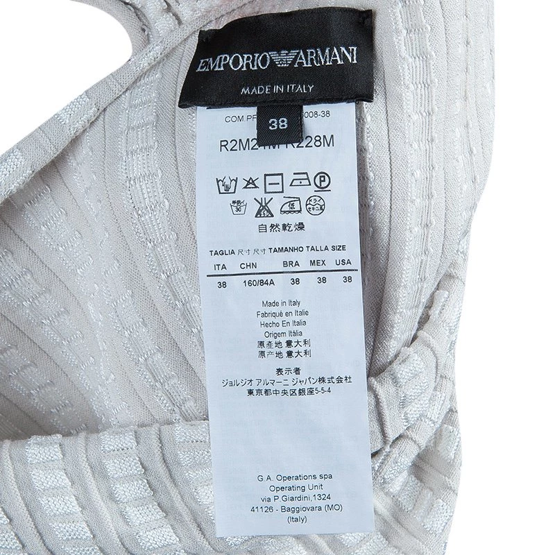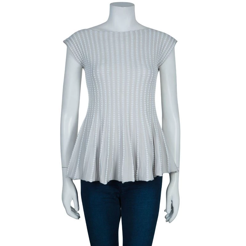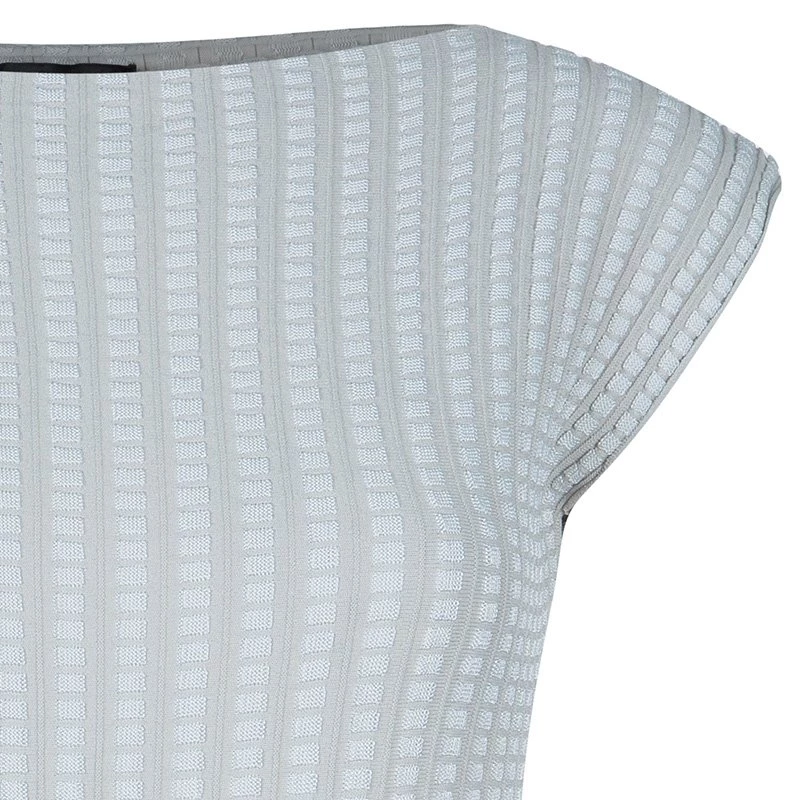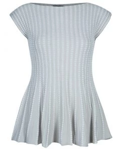 Simple and formal, this Emporio Armani textured top is perfect for office wear. Made from a viscose polyester blend, it has a round neck, cap sleeves and a pleated peplum design towards the hems.