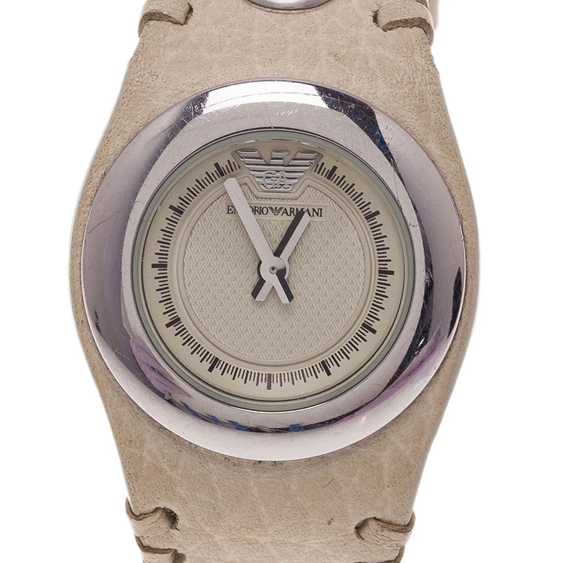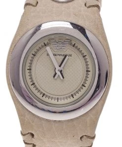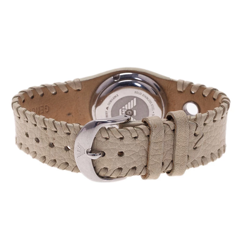 This elegant women’s watch by Emporio Armani comes in a stainless steel case with the brand name engraved at the top, right below the famous eagle logo of Giorgio Armani. The dial comes in a cream color housing the hour hands in silver-tone with no visible numbers. The beige leather strap has stitches all over to give that casual look. The strap comes with a buckle closure.