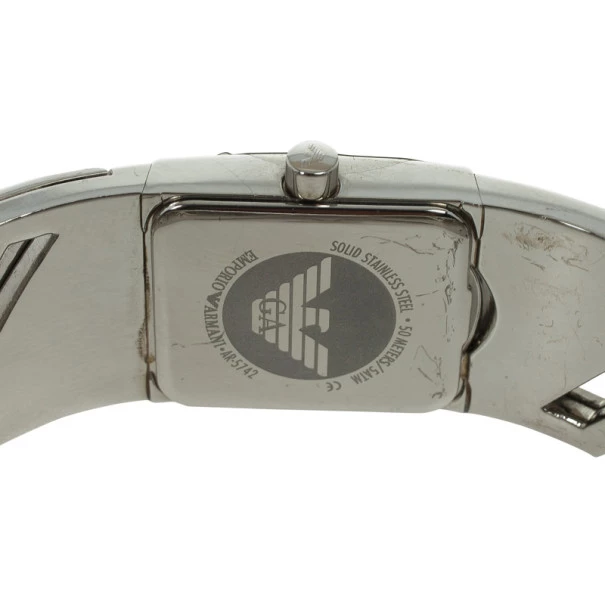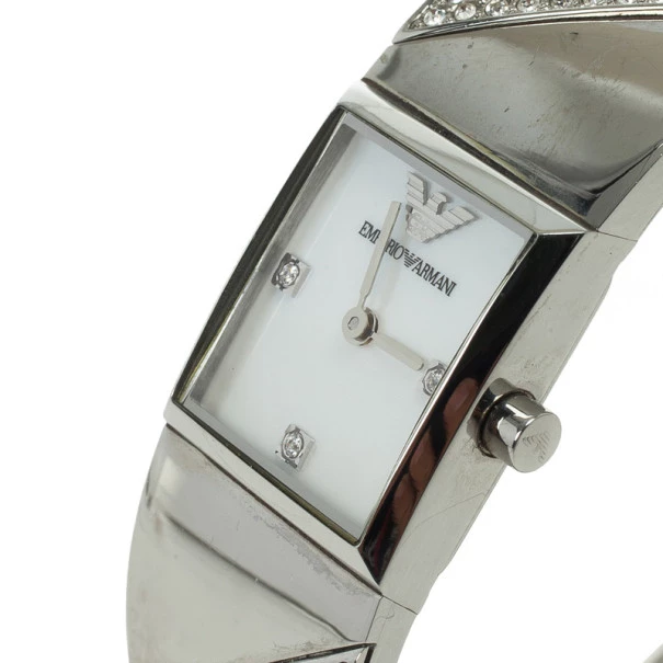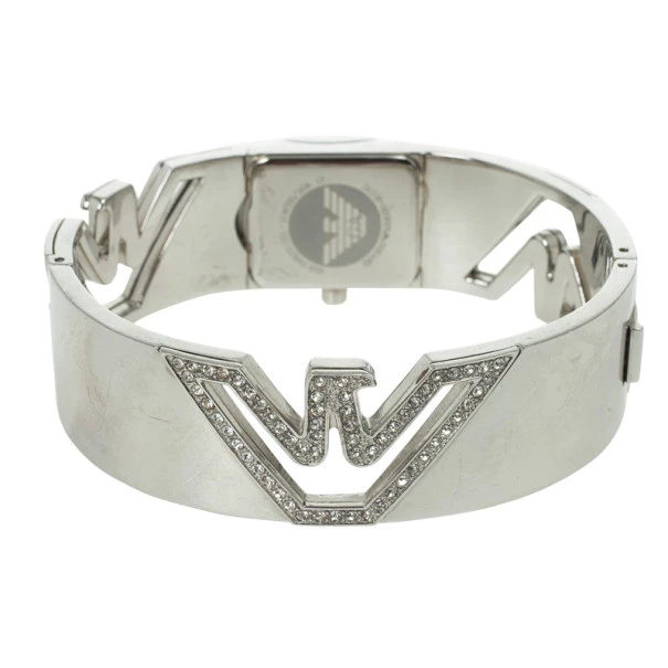 Add a little sparkle to your outfit when you adorn your hand with this Emporio Armani watch. The white dial houses three crystal embellished hour indicators, the brand logo and steel hour hands. The bangle has crystal embellished logo cut out detailing. This watch is 30 m water resistant.