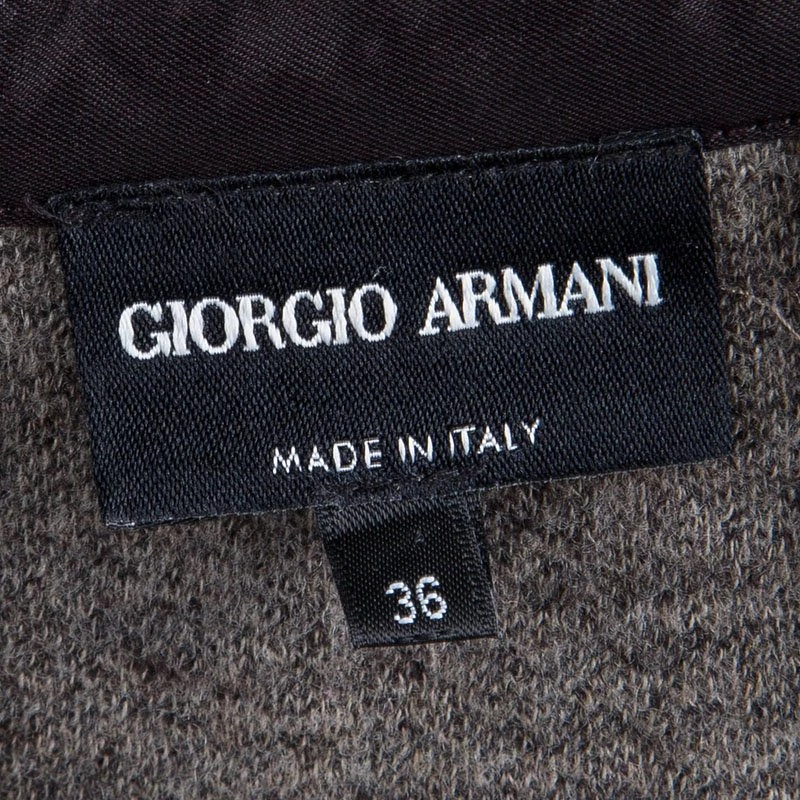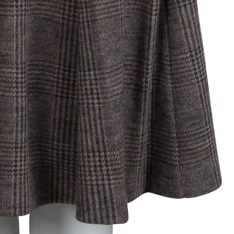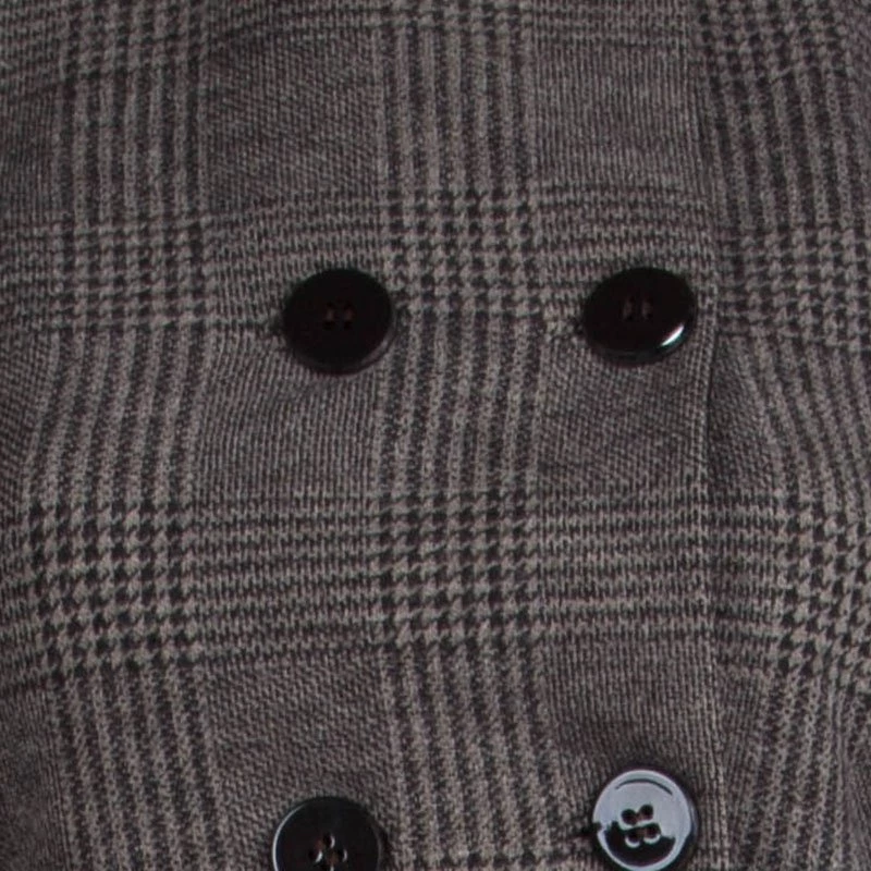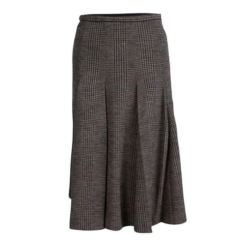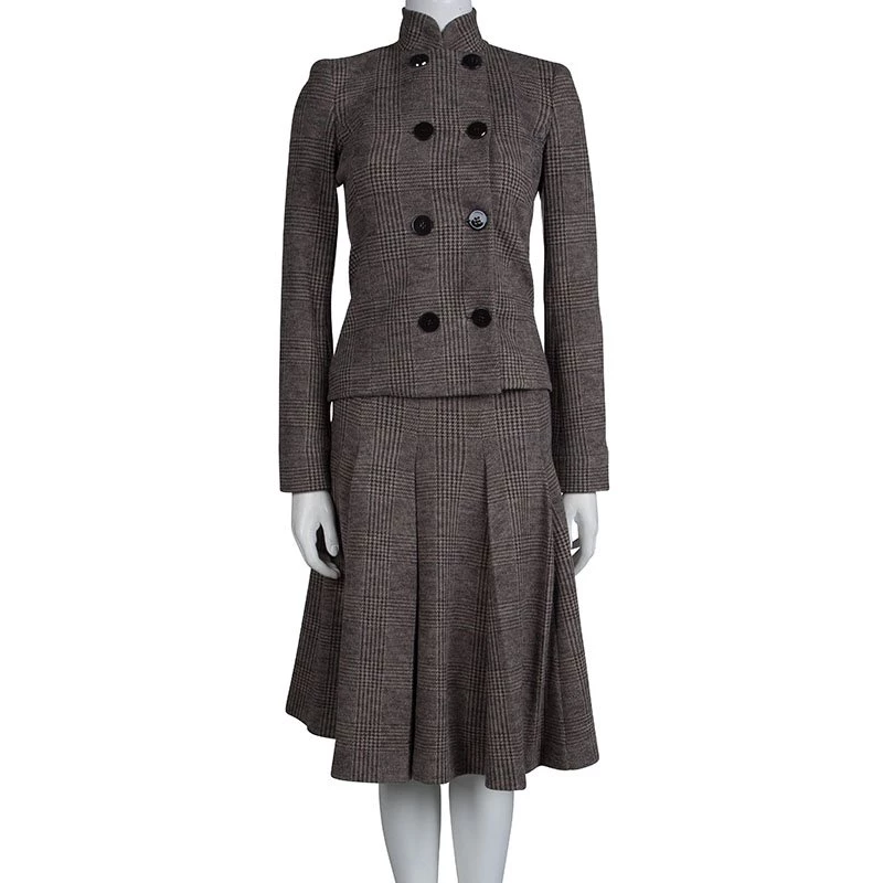 Armani’s take on the classic skirt suit set, this design features Prince Of Wales Checkered pattern. A double breasted pattern is accented with large glossy buttons. A close-fitting top and a pleated skirt present a flattering, feminine silhouette. The mandarin collar gives it a formal edge.