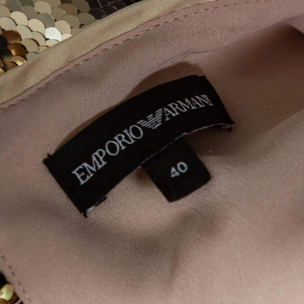 Make a glamorous entrance at the next cocktail party in this mini dress from Emporio Armani. The stunning creation is decked with gold sequin embellishments all over. A simple round neck and short sleeves finish the luxurious dress.