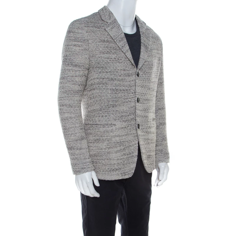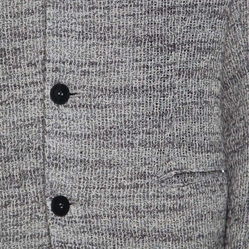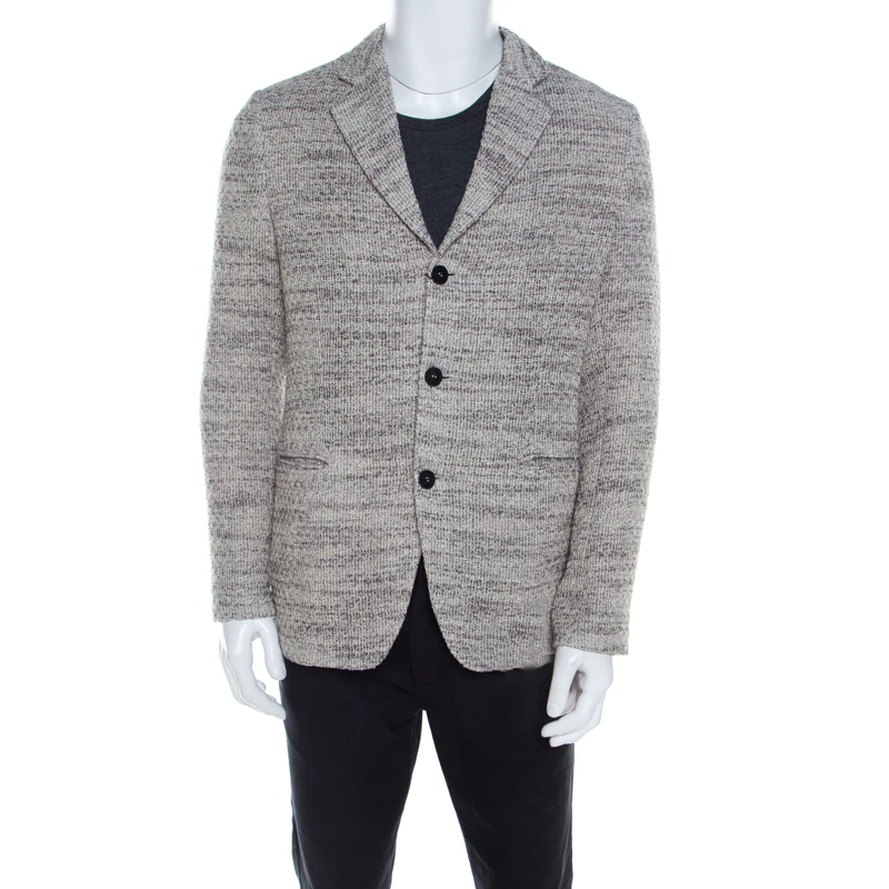 The sharp tailoring and minimal aesthetics of this Emporio Armani blazer will leave you amazed. It is crafted with a cotton blend featuring long sleeves. Flaunting a tweed finish all over and a front button fastening, this blazer will look great with your formal wears.