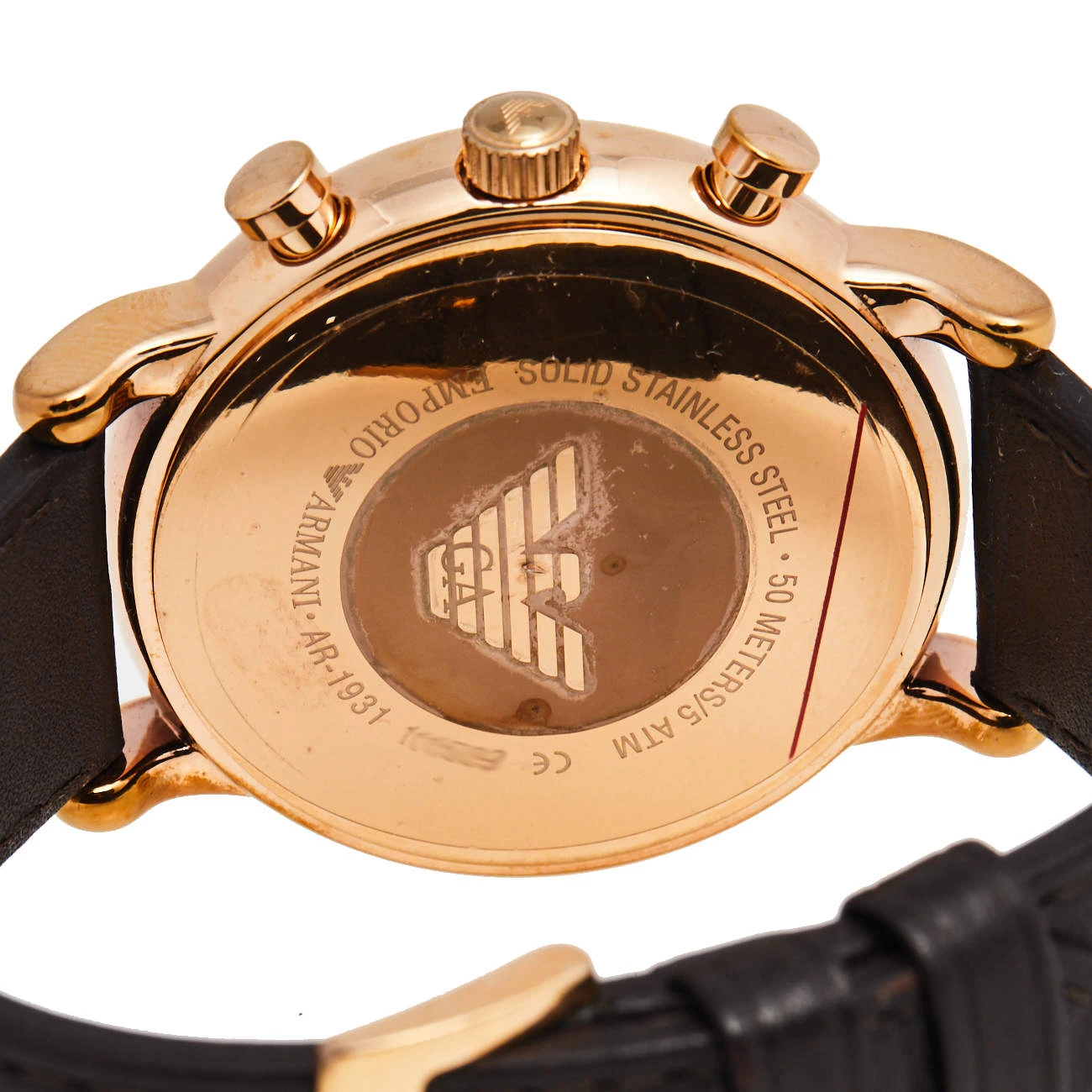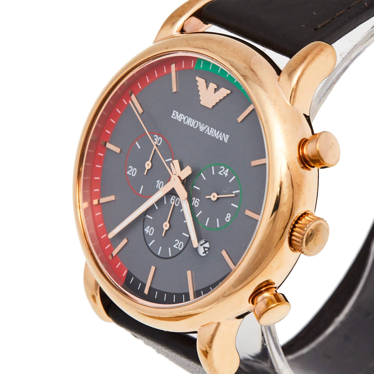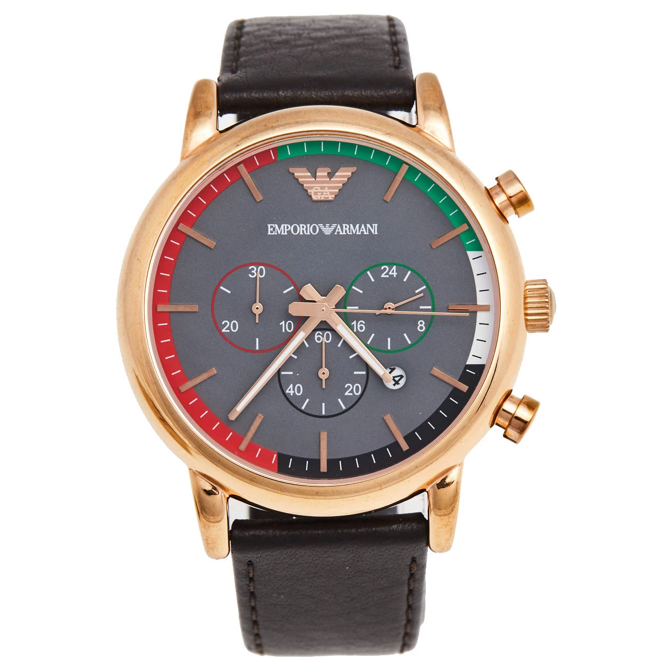 Emporio Armani’s watch was made in celebration of the UAE’s 44th National Day. It has a gold-plated stainless steel case and a black leather bracelet. The dial is the most beautiful element of this watch. It is set with gold-tone markers, three subdials, three hands, and the colors of the UAE flag — red, green, white, and black.