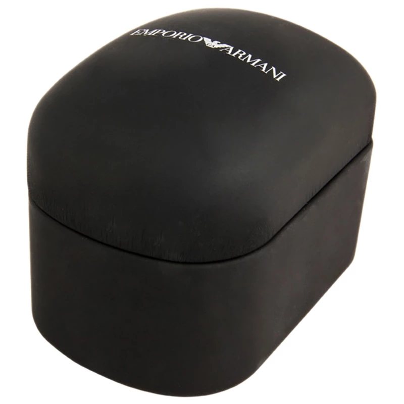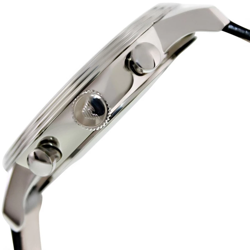 This timepiece is a unique creation for the modern man. Crafted from stainless steel, it features a round stainless case with a textured grey dial housing silver-tone arms, Roman numerals and a date window at 6 o’clock. The two sub -dials enable its chronograph capabilities and the Emporio Armani logo speaks volumes of the quality craftsmanship that has gone into making this watch. This 50m resistant watch fixes on the wrist with a brown leather strap and a buckle closure.