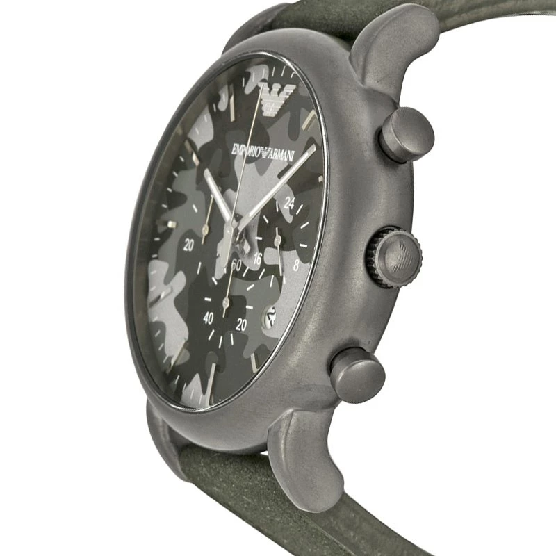 Allow this stylish and cool timepiece by Emporio Armani to add a class to your look. Made from stainless steel, it features a round grey bezel that counters an eye-catching camouflage dial. This watch houses a date window between 4 o’clock and 5 o’clock, luminescent hands and hour indicators along with three sub-dials that enable its chronograph capabilities. The leather bracelet is accentuated with a buckle closure and the 50M water resistant watch has quartz movement.