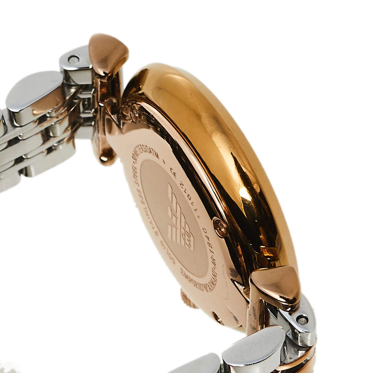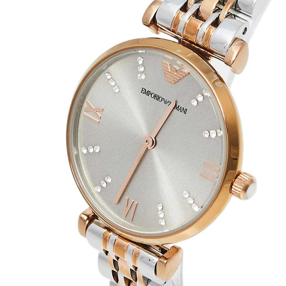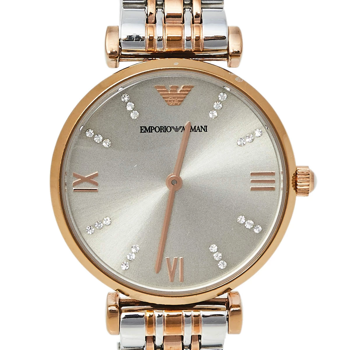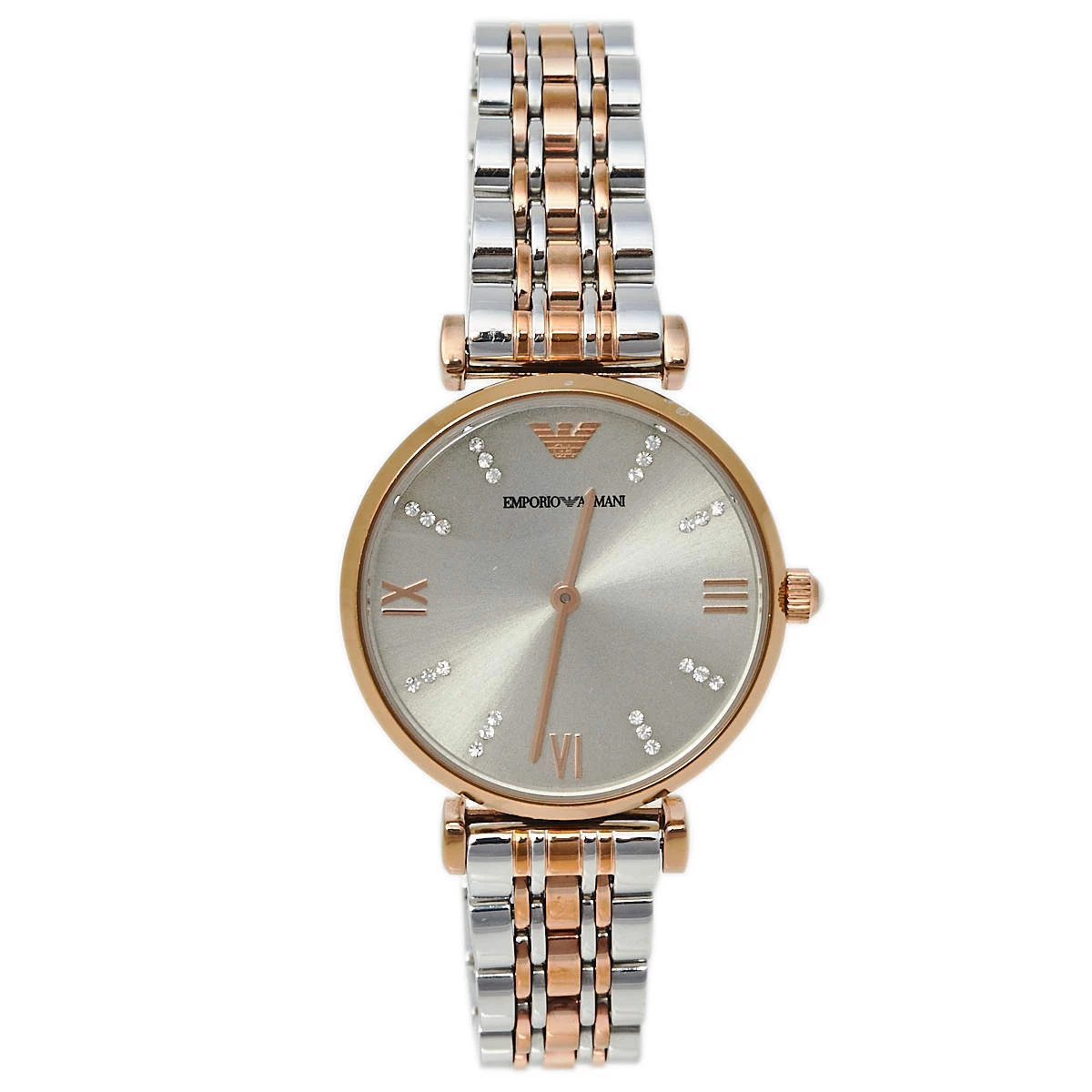 The case of this Emporio Armani wristwatch is made from two-tone stainless steel and held by a chainlink bracelet. The grey dial is smooth and fixed with index and Roman numeral hour markers, two hands, and the brand logo. The quartz watch has a smooth bezel and can be fastened to your wrist using the push clasp.