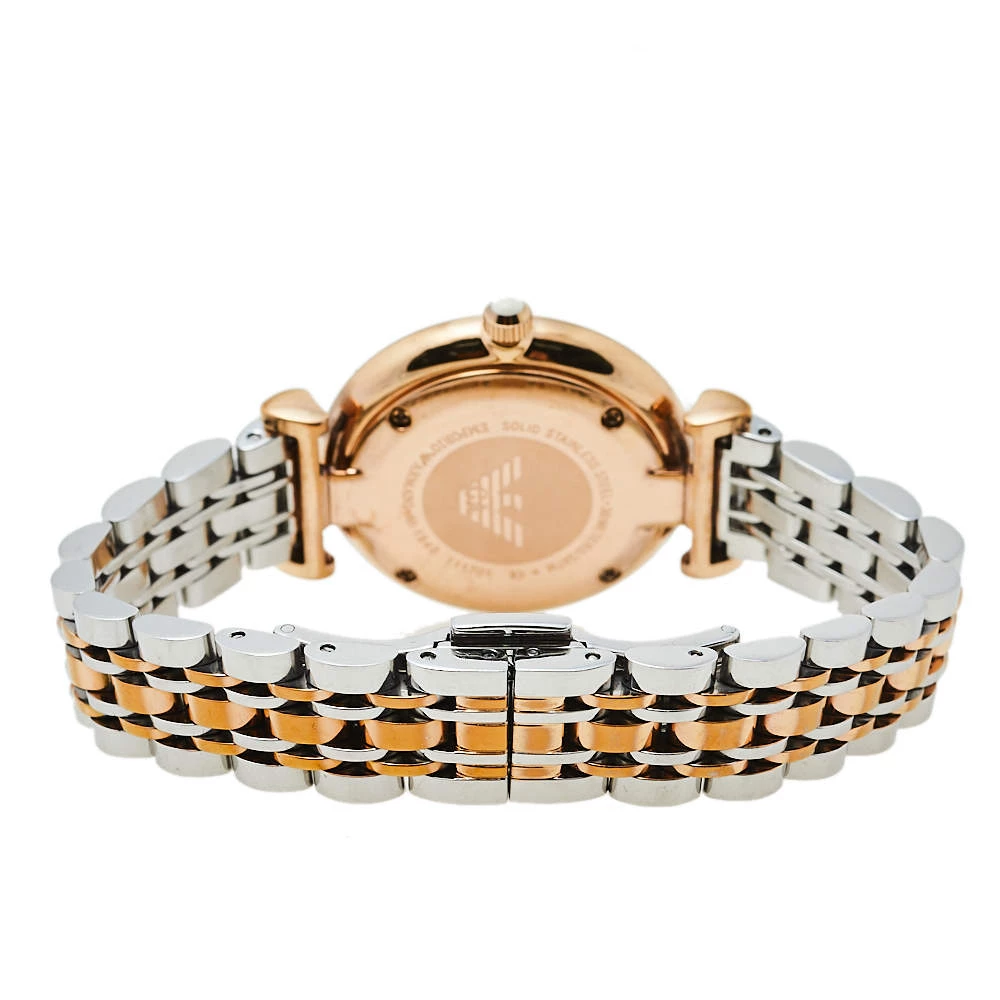 Made with expertise using two-toned stainless steel, this watch by Emporio Armani is an example of excellent craftsmanship and style. It features a smooth bezel and a rounded dial with elegant hour markers, the brand logo at 12 o’clock position, and two hands. This quartz watch is a luxury that deserves to be on your wrist.