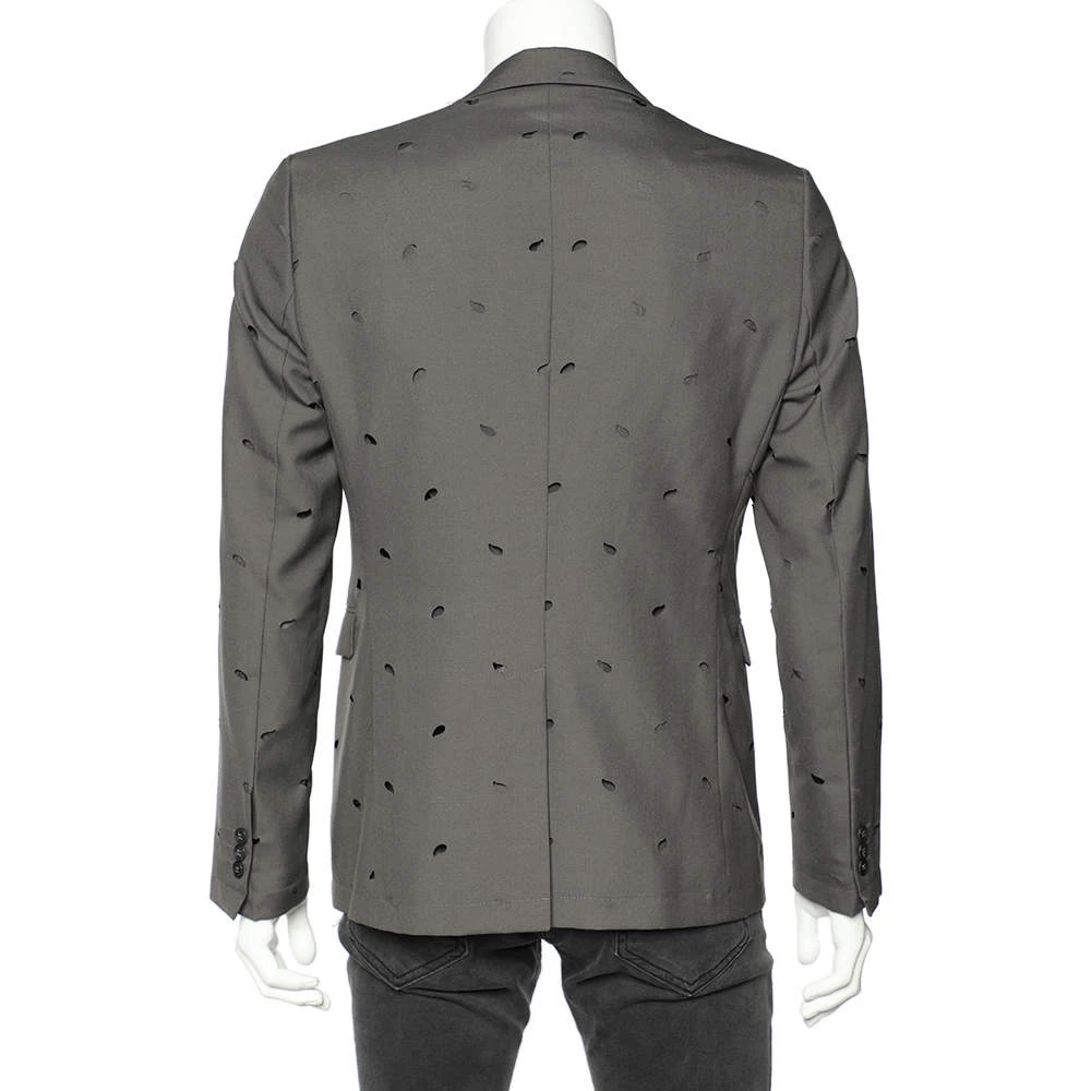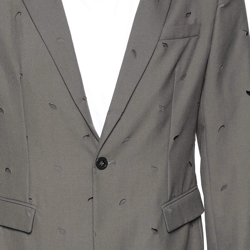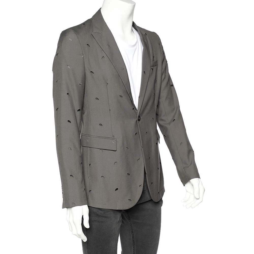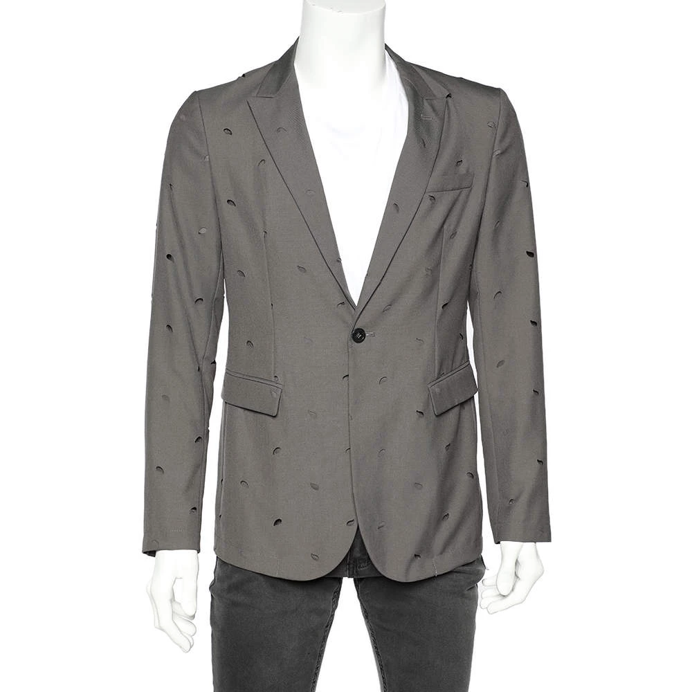 Flaunt luxe style and panache as you wear this blazer from Emporio Armani. It is designed using grey wool and shows a cut-out patterned detailing, buttoned closure, and a single-breasted style.