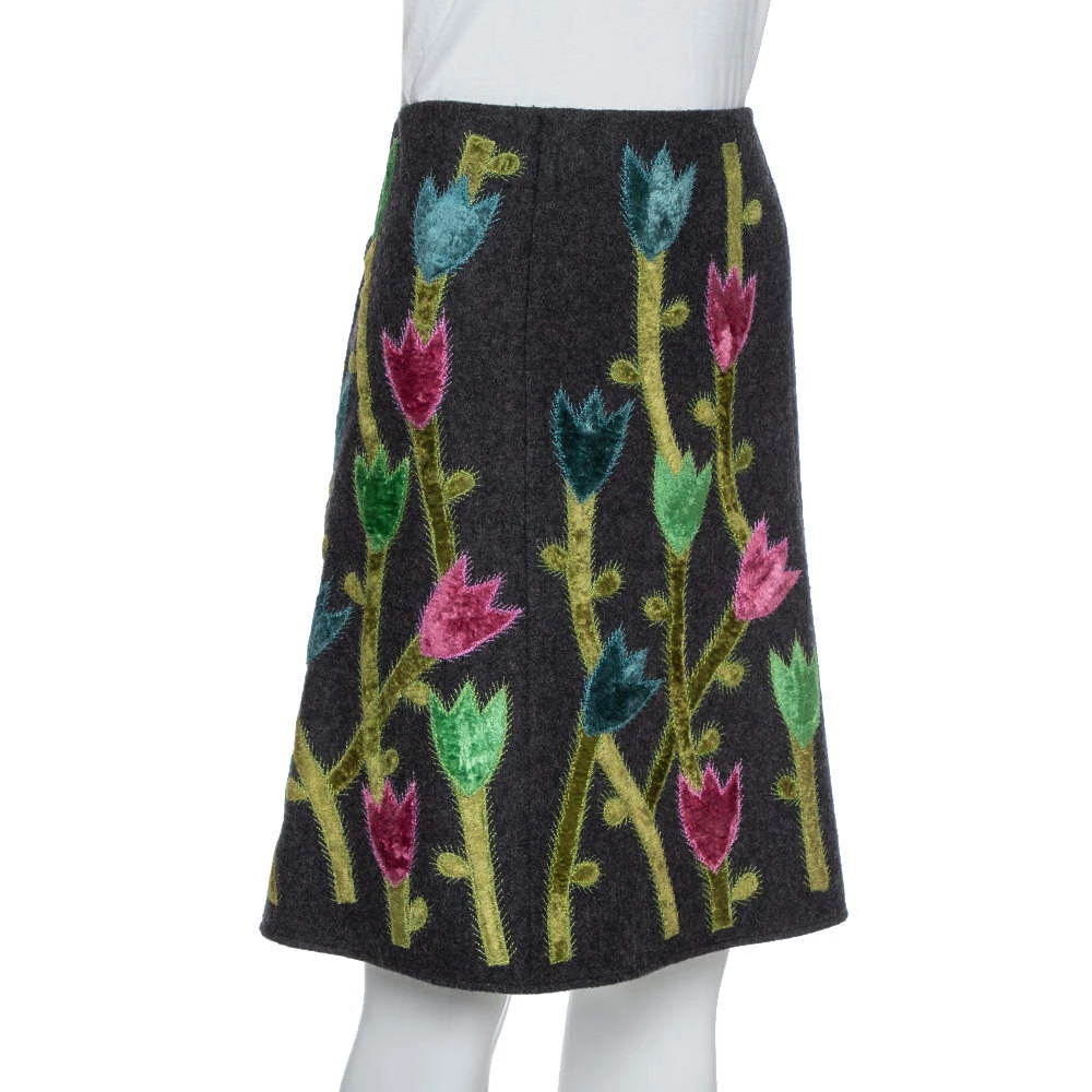 Stylish and playful, this Emporio Armani skirt is great for day outings. It has been crafted from quality wool and carries a grey hue. It has an A-line silhouette with floral applique detailing that adds interest. The flattering skirt is secured with a back zip closure.