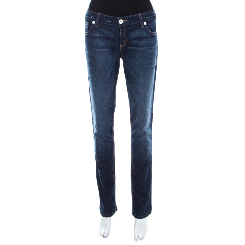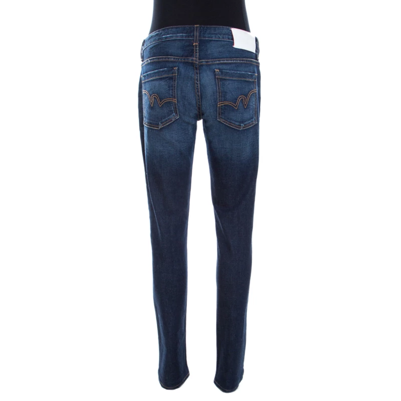 This amazing casual wear is the creation of Emporio Armani, made in the classic blue with a faded effect. This pair of tapered jeans are tailored from cotton blends that provide a great fit. This distressed denim piece comes with five external pockets and a zip closure.
