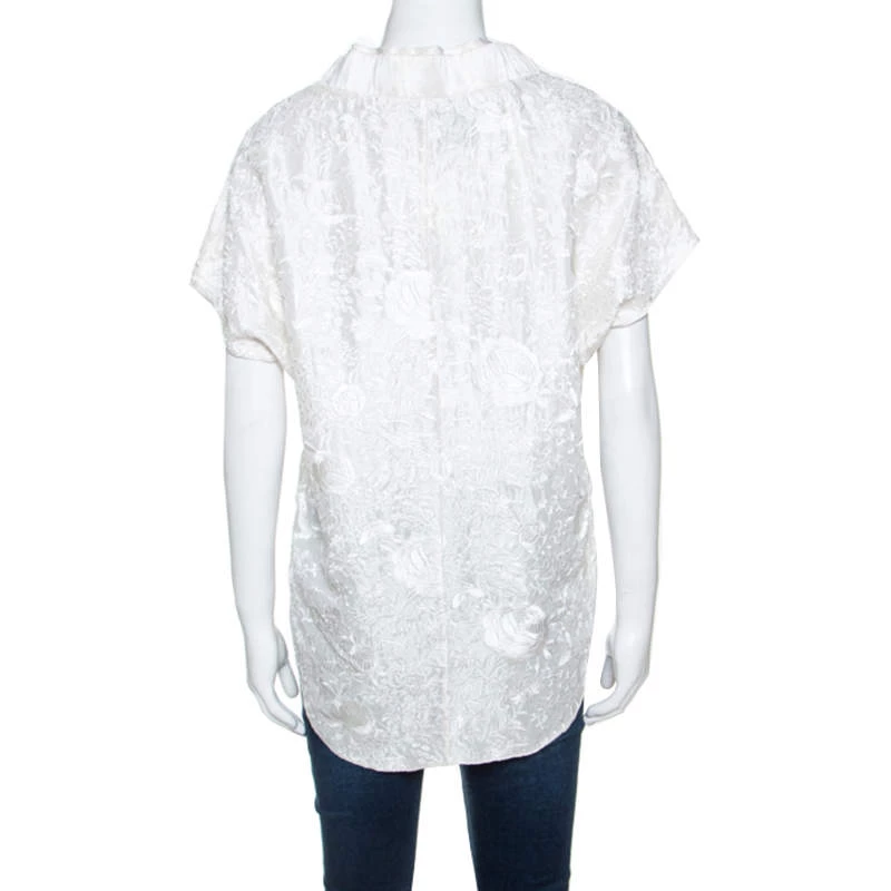 This magnificent Emporio Armani top is a blend of bold and feminine style. Crafted from a lovely silk blend, it comes in an ivory color. It features stunning floral embroidery throughout. It is cut to offer a comfortable fit. Pair it black pants for a classic look.