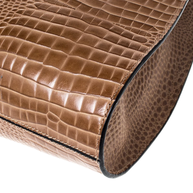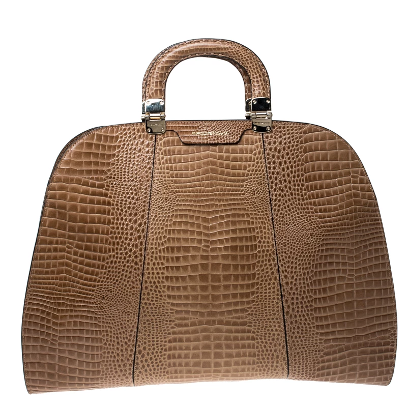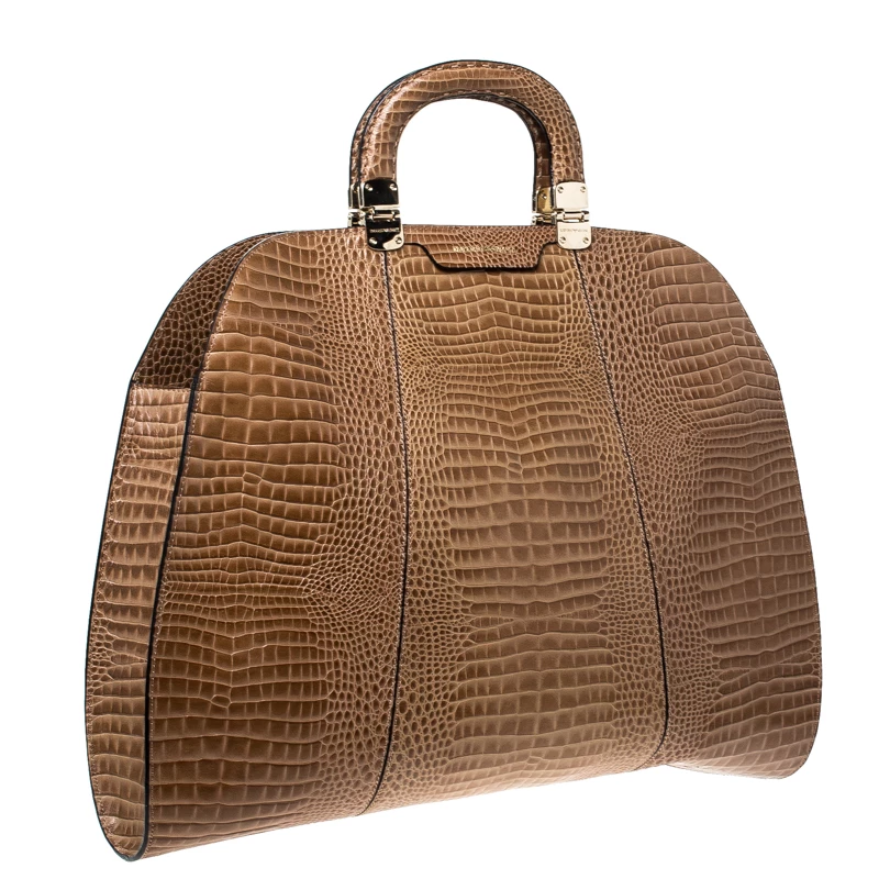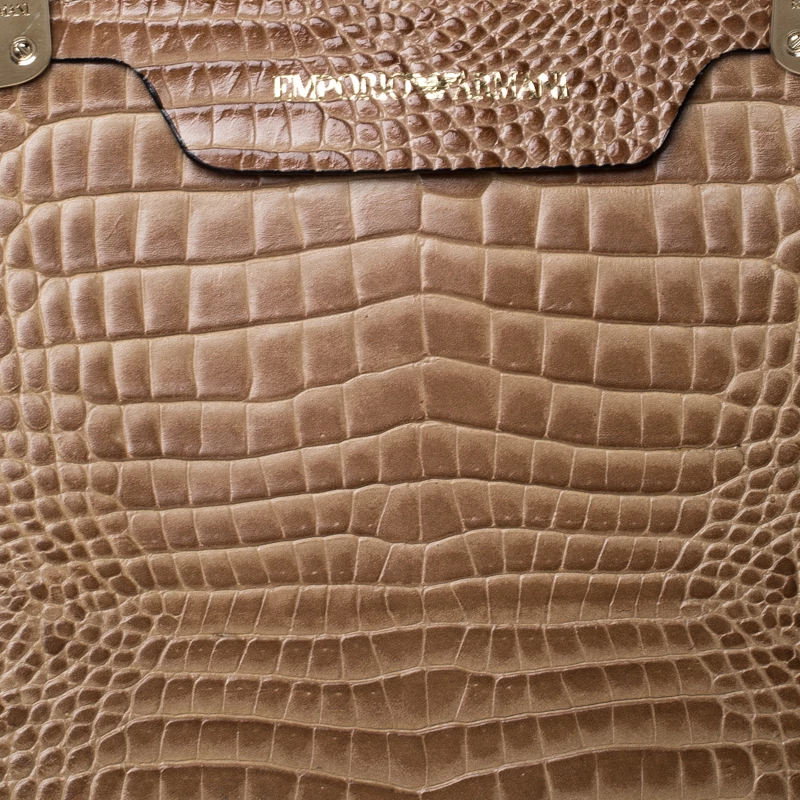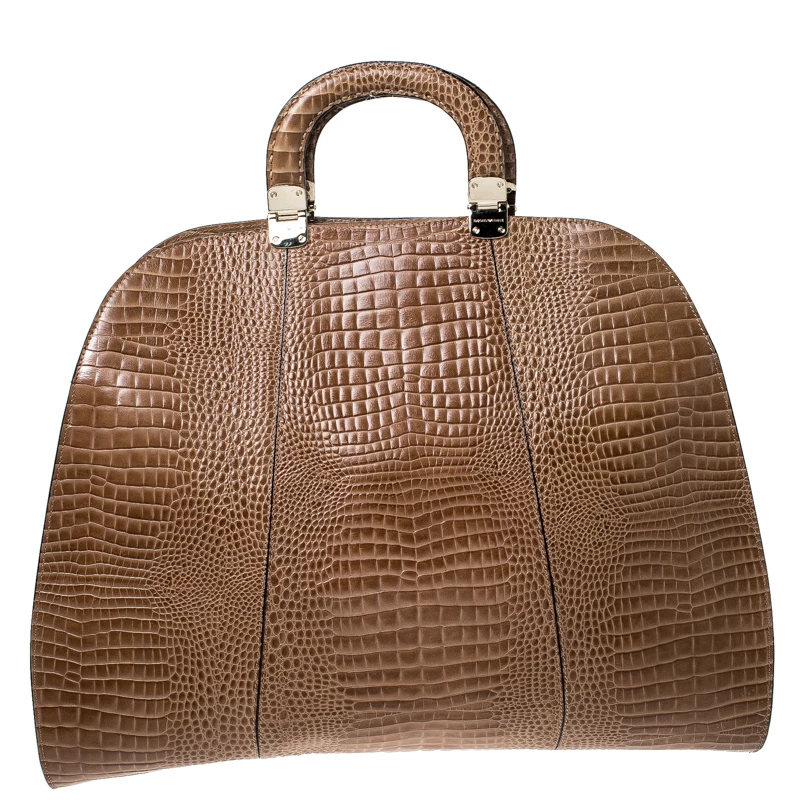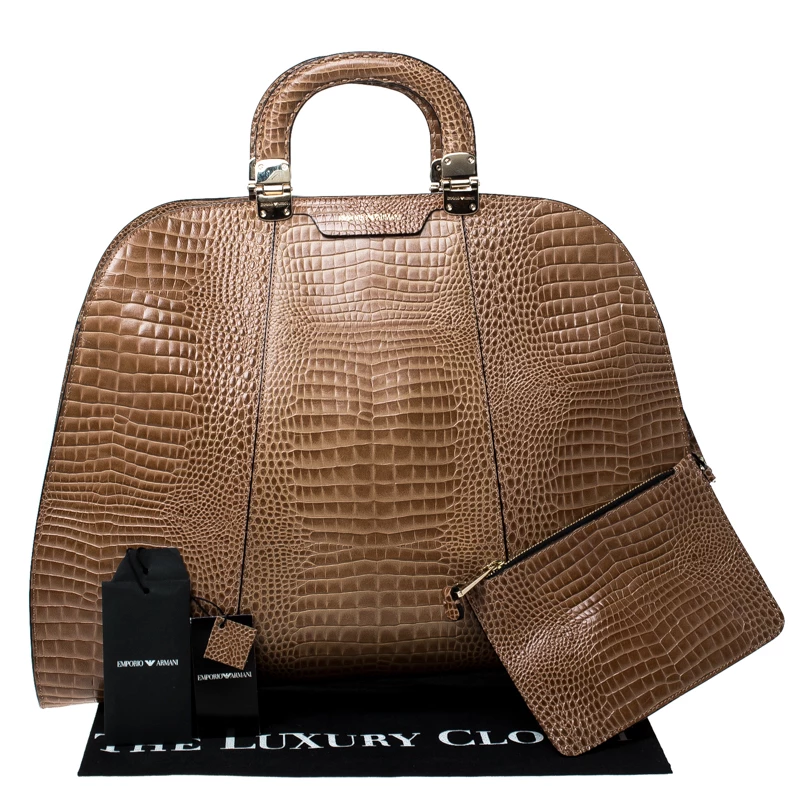 This Emporia Armani satchel is designed in a light brown croc-embossed leather in a chic and feminine silhouette with close resemblance to a dome shape. It comes with a detachable pouch with a zipper closure to secure little knick-knacks. Showcase the elegant style by carrying it in the crook of your arms with the two top handles.