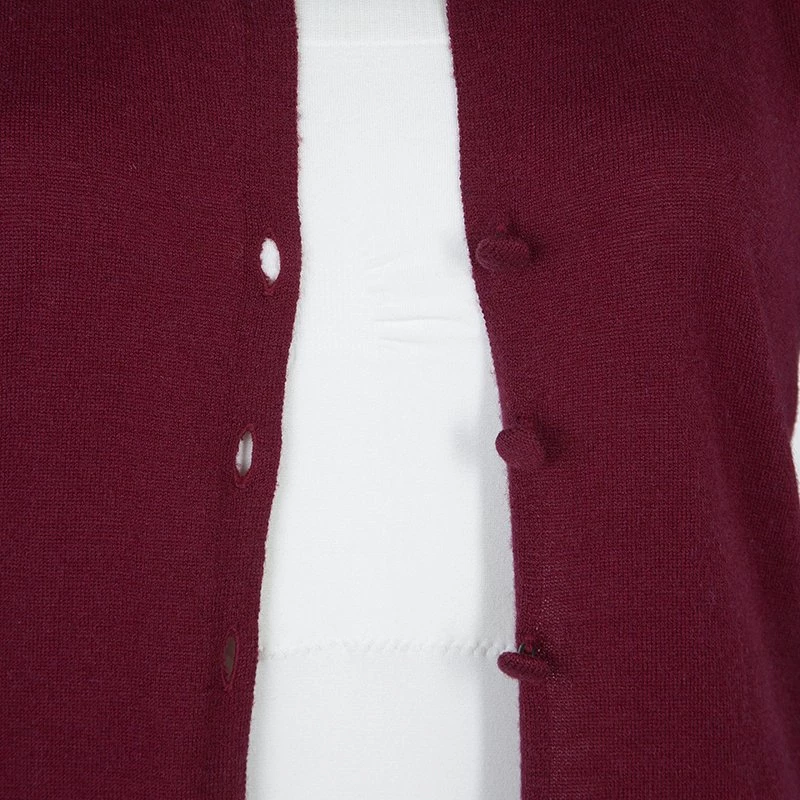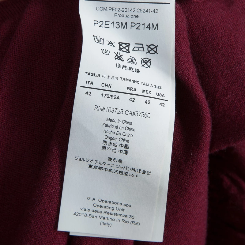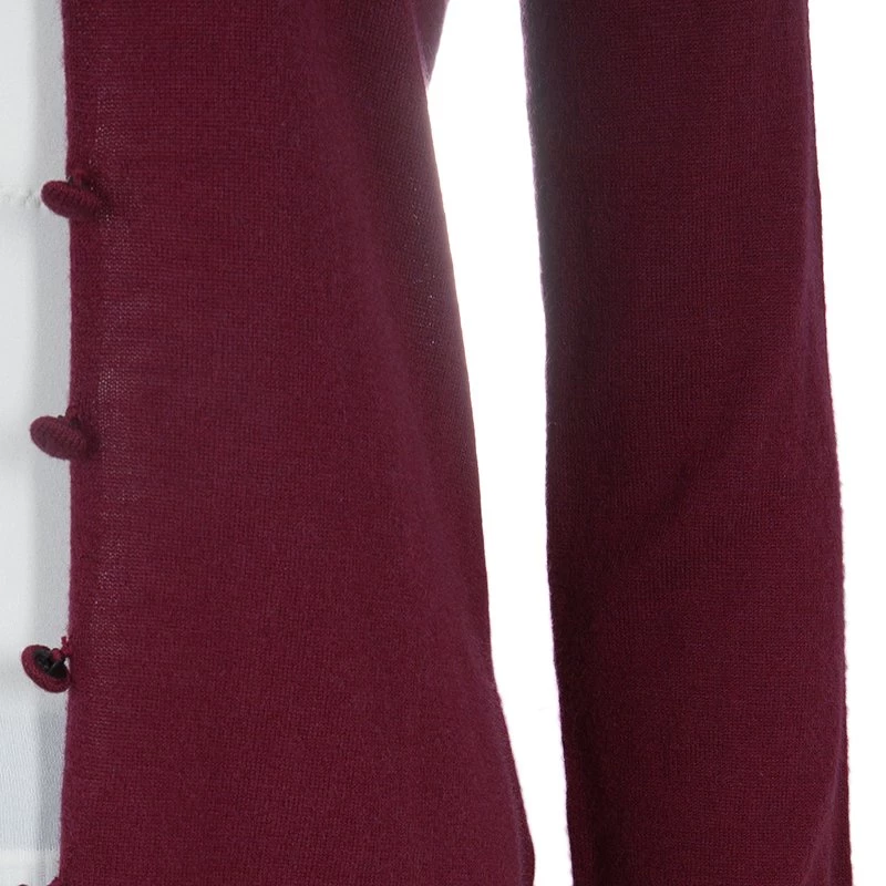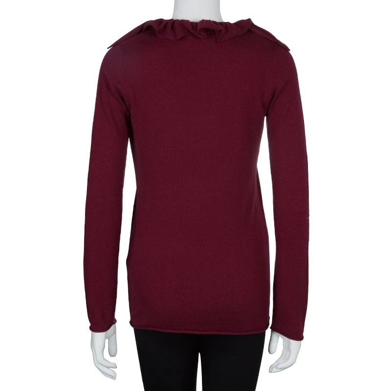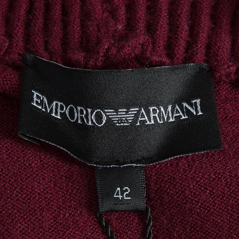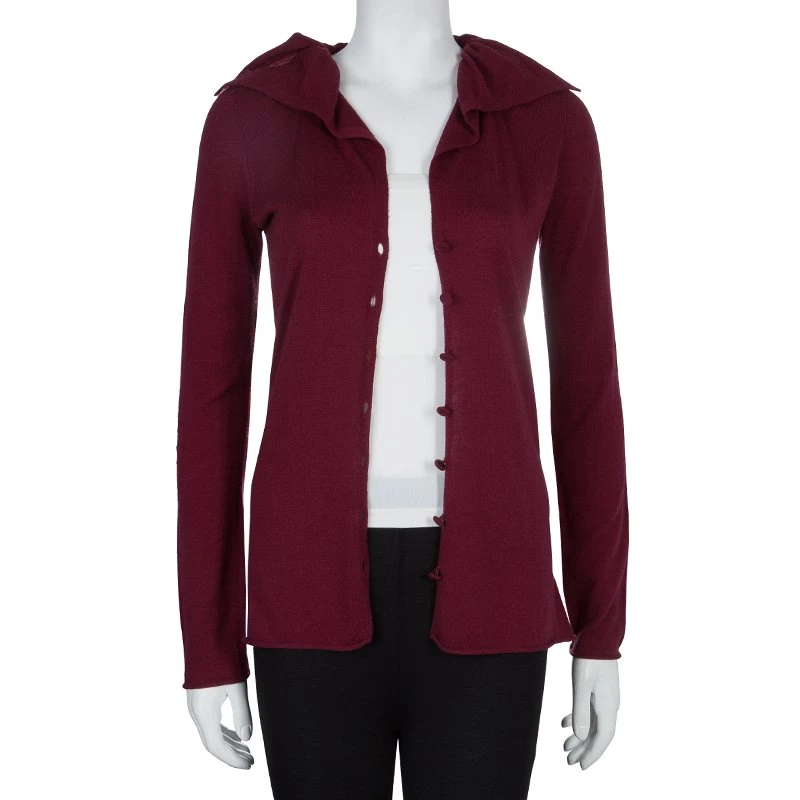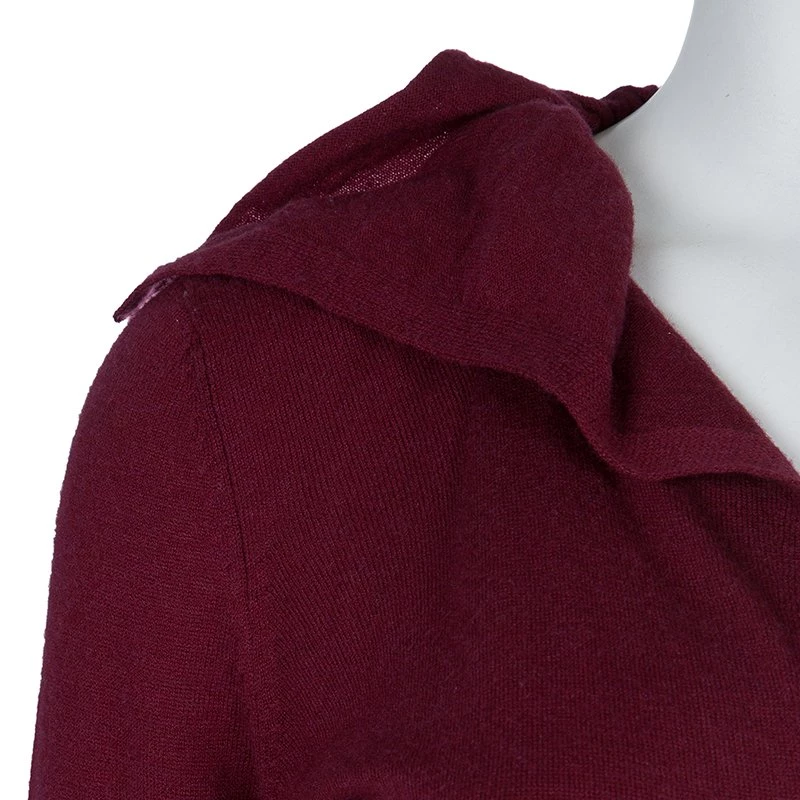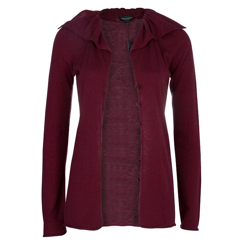 The Emporio Armani’s cardigan exemplifies the brand’s playful character with exquisite stitch and distinguishing features. Crafted in a blend of maroon wool, viscose, polyamide with a hint of cashmere, the button down cardigan has long sleeves with rolled up hem. The ruffled collar is accentuated by sequin detail and the fitted silhouette gives a figure flattering contouring.