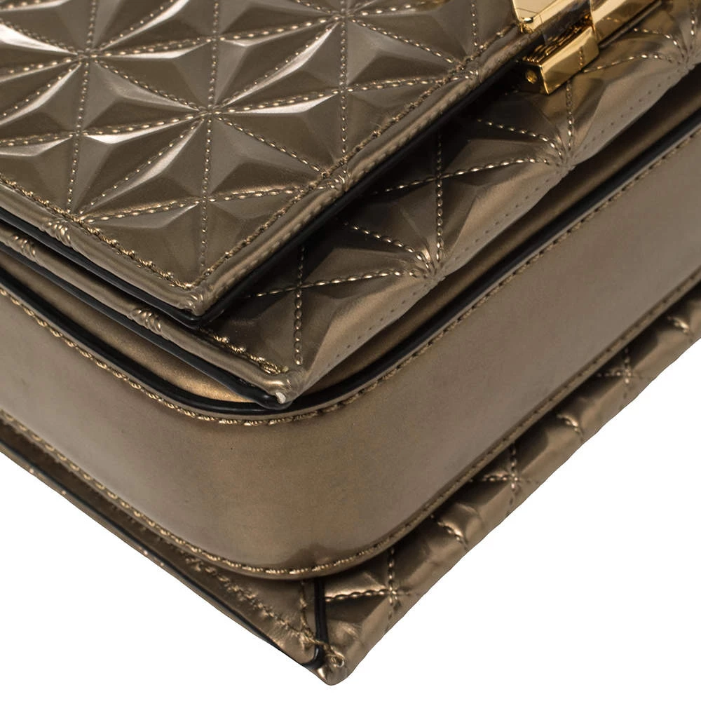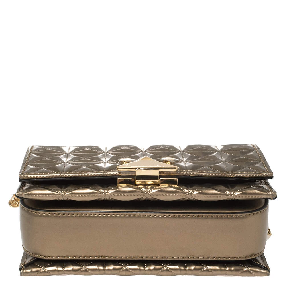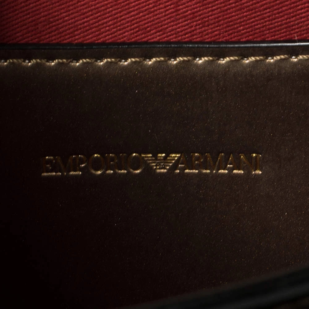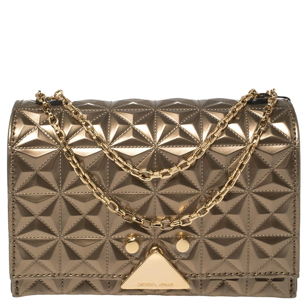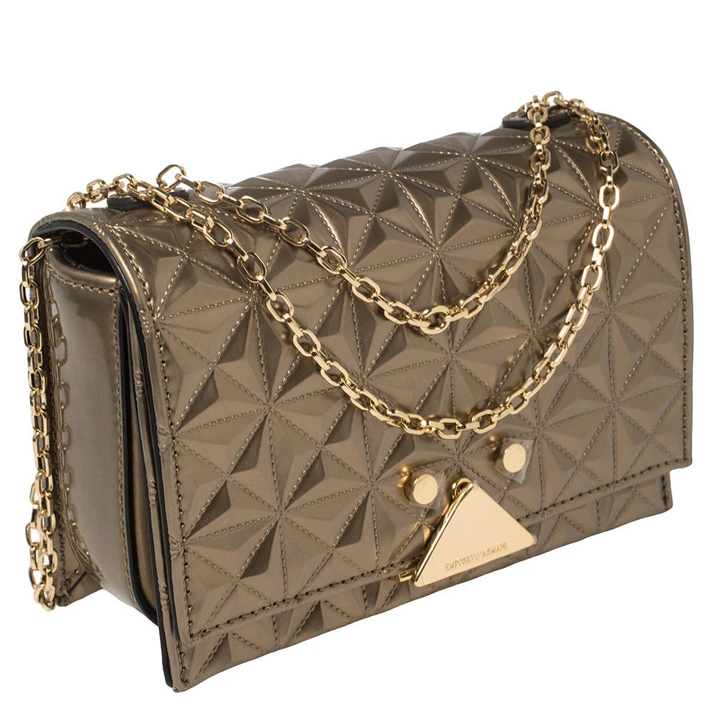 Fall in love with this absolutely stylish handbag from Emporio Armani. Made from quilted patent leather, this metallic bronze bag is both reliable and dressy. The structured shape comes with a well-sized interior secured by a front flap.