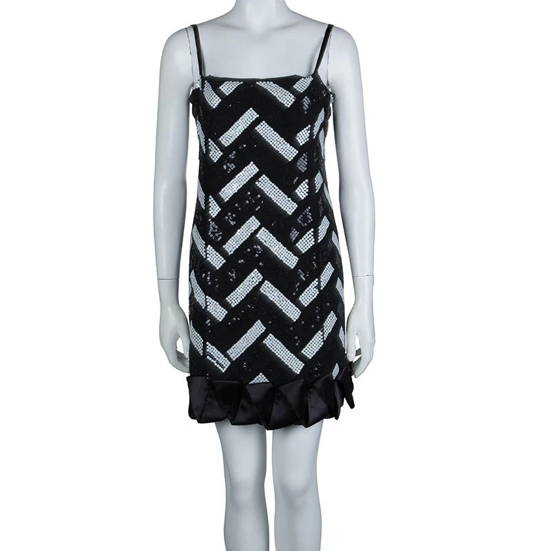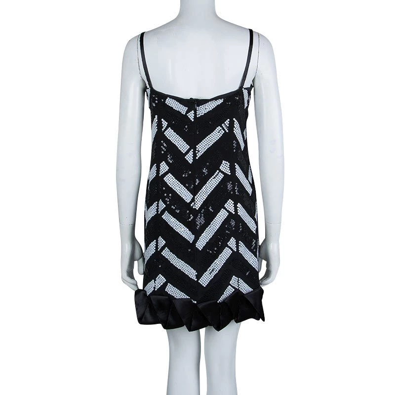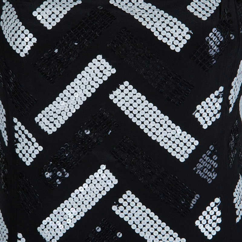 Designed to impress, this monochrome sleeveless dress by Emporio Armani is classic and elegant. Featuring spaghetti straps and deep square neckline, the dress is cut from soft fabric for the lining and has sequin embellishments all over the bodice. The hemline has a black border with multiple pleats, adding more charm to the entire dress.