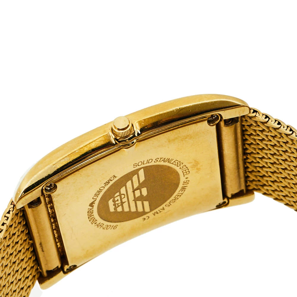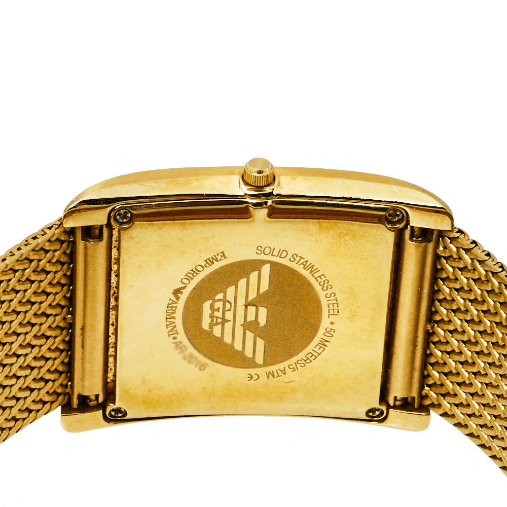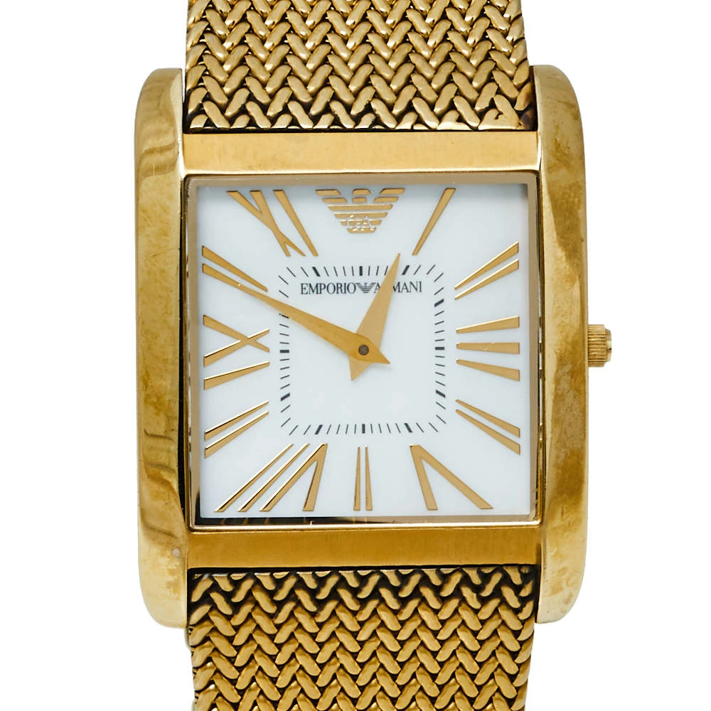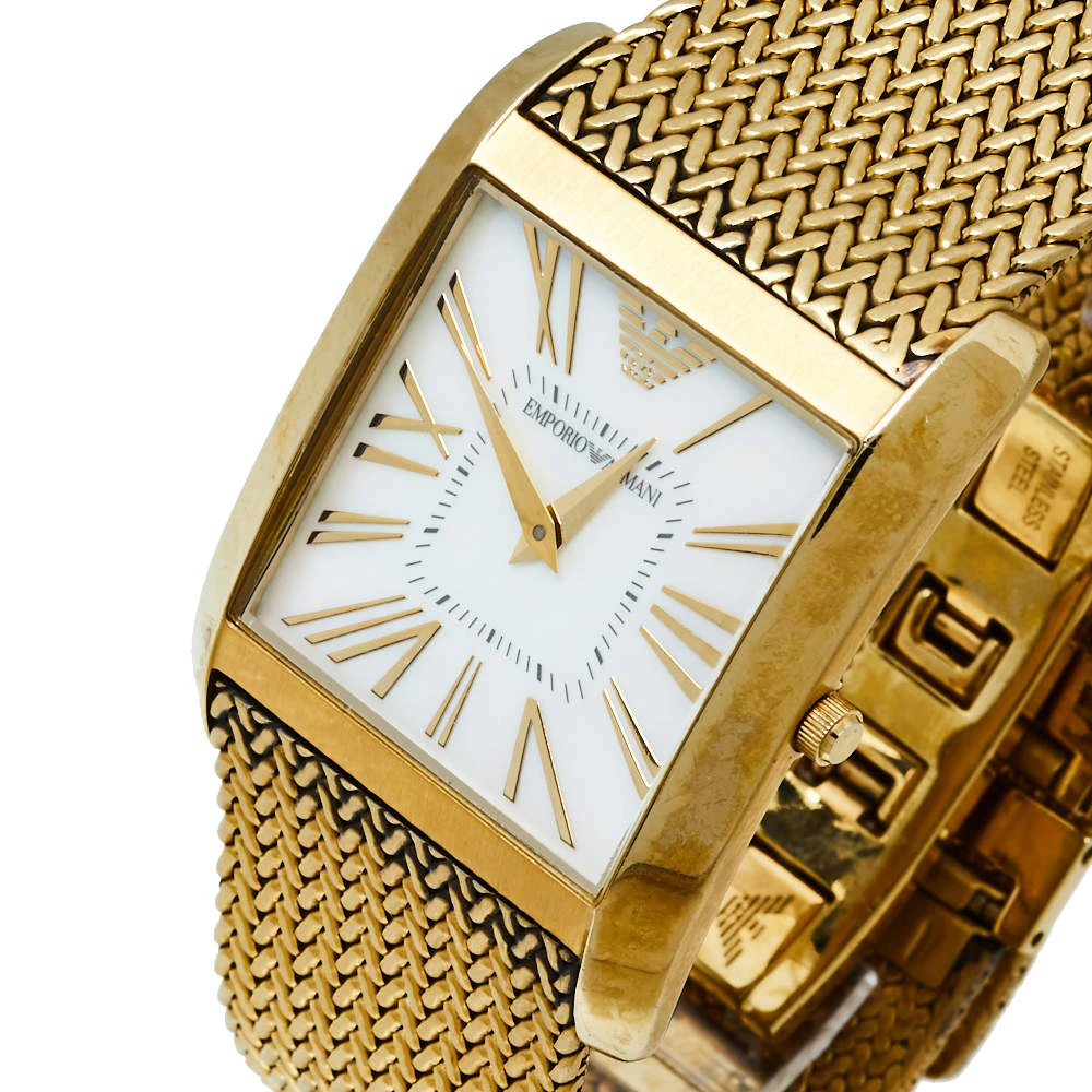 This elegant Emporio Armani wristwatch is made from gold-plated stainless steel featuring a 31 mm case held by a chainlink bracelet. The mother of pearl dial is smooth and fixed with index and Roman numeral hour markers and the brand logo. The quartz watch has a smooth bezel and can be fastened to your wrist using the push clasp. (Note: The item may be restricted for shipping outside the UAE. Please contact us on [email protected] to check if the item can be shipped to your country.)