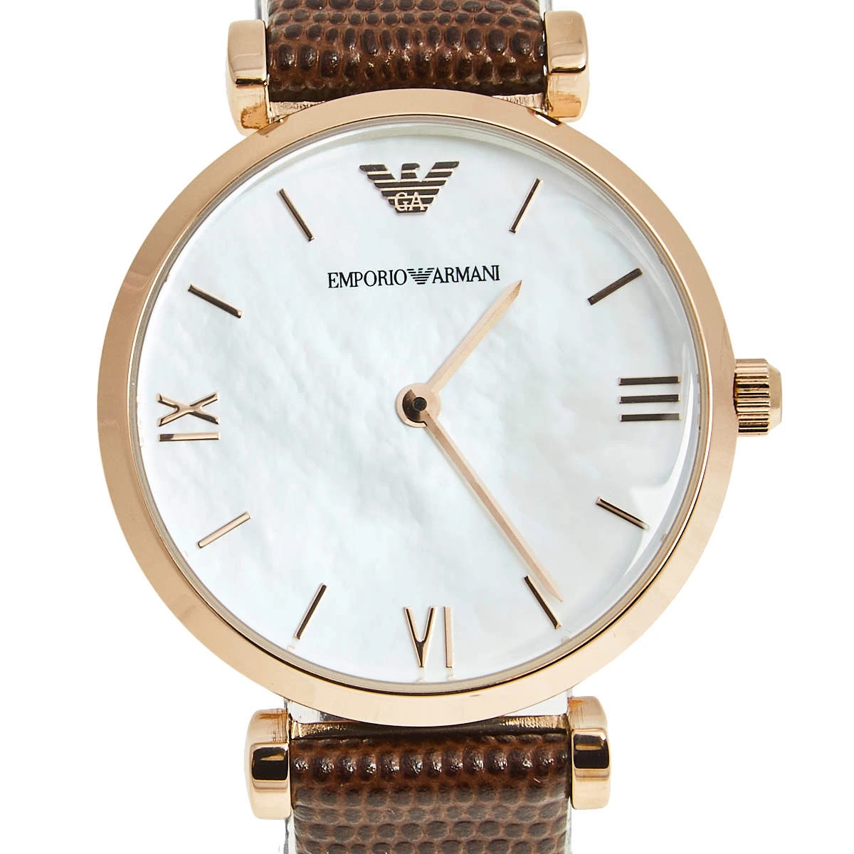 Let this Emporio Armani watch keep you on time and add to your everyday style. The rose gold-plated stainless steel case comes with a mother of pearl dial flaunting elegant hour markers, two hands, and the logo at the 12 o’clock position. It is complete with a leather bracelet.
